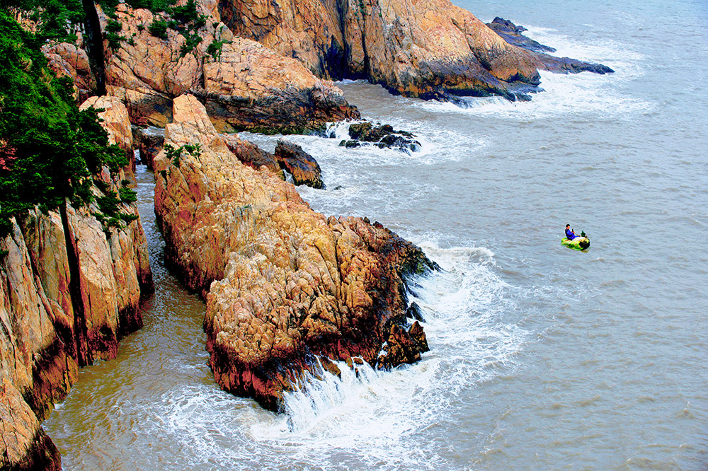 驚濤拍岸,一只小舟在怪石嶙峻峻、狂浪涌動的礁石邊撒網(wǎng)捕魚。