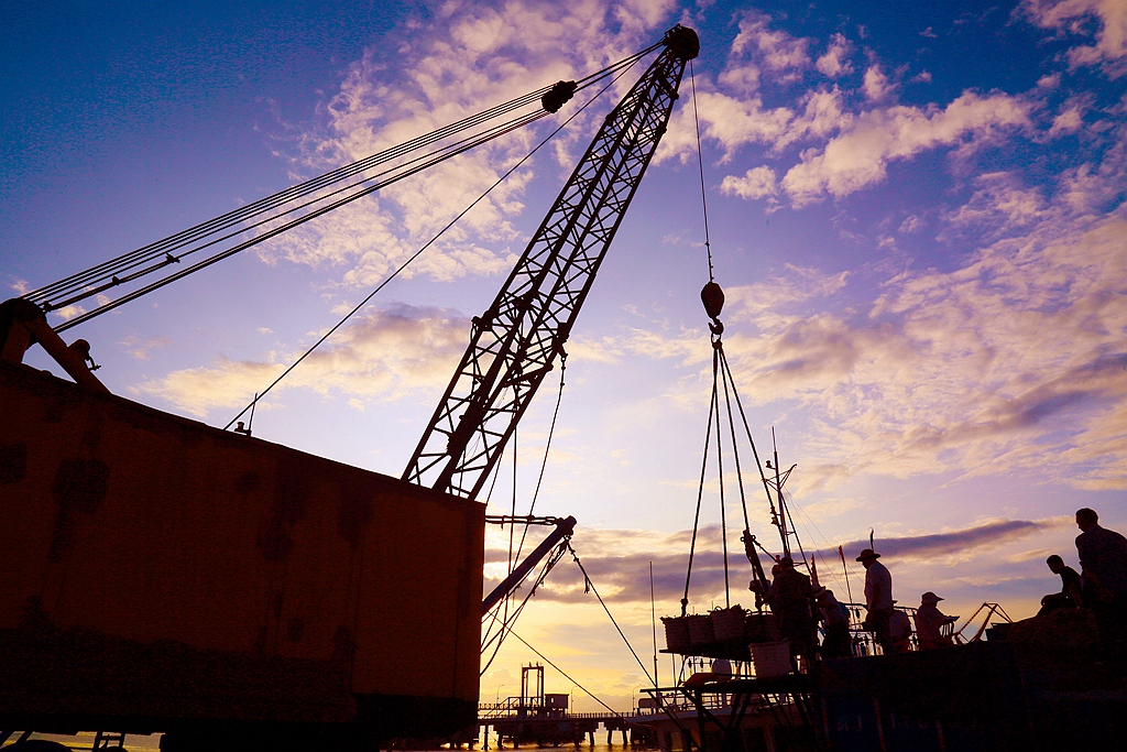 臺州玉環(huán)大麥嶼碼頭,夕陽下,工人們在一臺吊機配合下,正在將船倉內(nèi)的魚貨吊裝上岸。