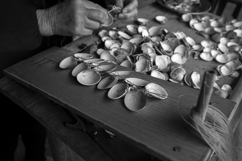 家里的老人利用空閑時間幫忙制作養(yǎng)殖紫菜的用具。2021.3,蒼南