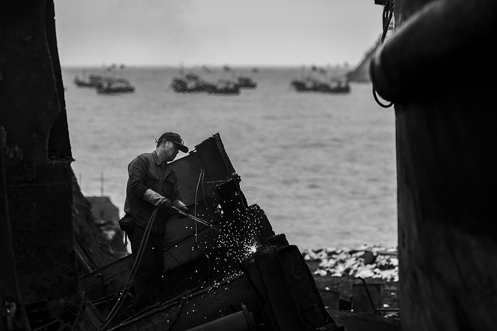 工人拆解報廢的船只。兇猛的海風和腐蝕性的海水減短了船只的壽命。2021.3,蒼南