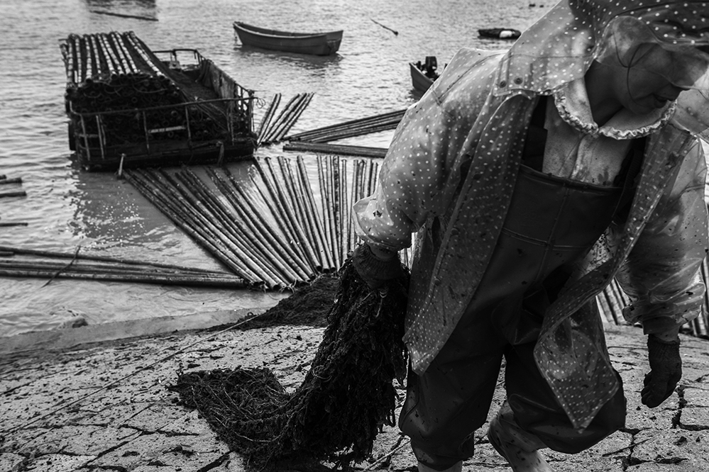 收割回來的紫菜就在岸邊的作坊加工。2016.11,蒼南
