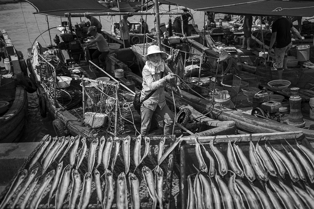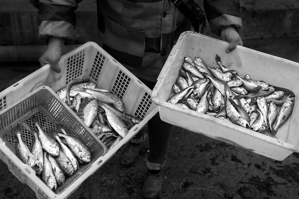 船只靠岸后,全家人不分男女參與勞作。2021.3,蒼南