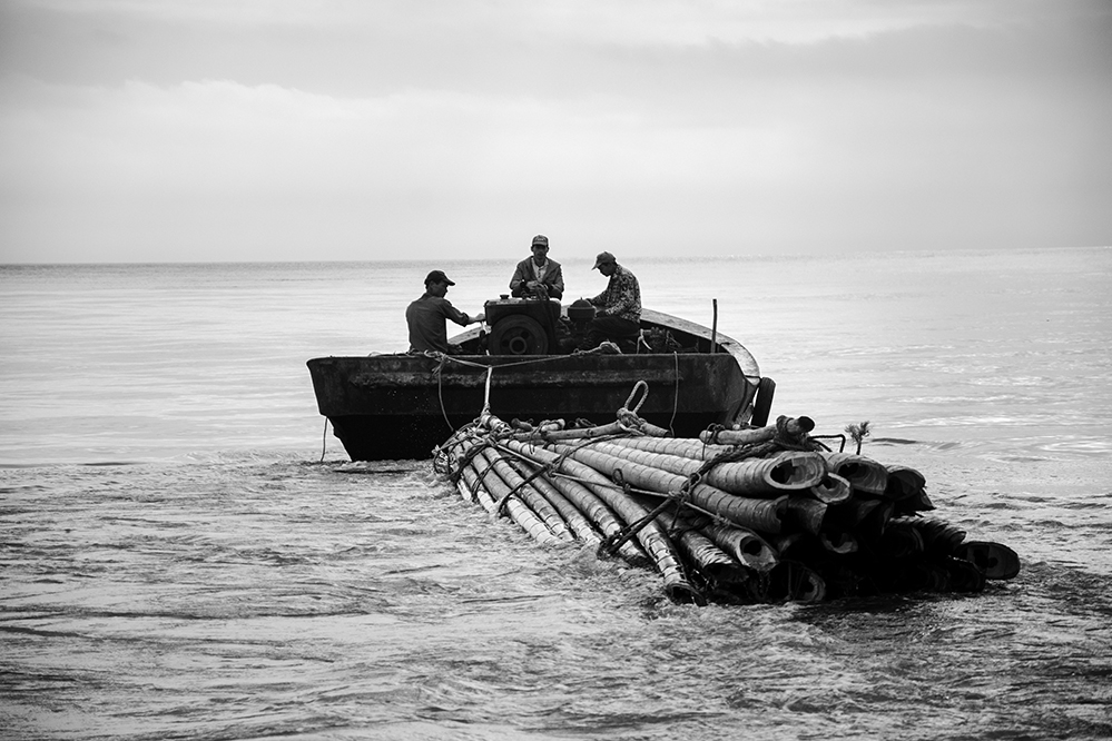 漁民拉著十幾米長的毛竹出海,他們要把毛竹立在海里搭設架子種植紫菜。2018.11,蒼南