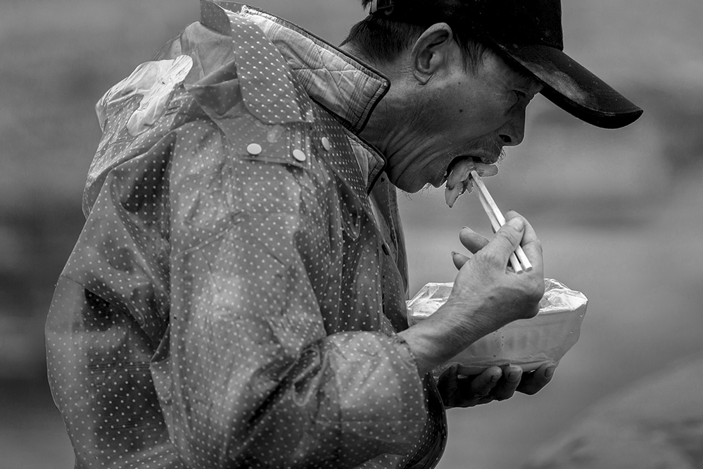漁民在岸邊狼吞虎咽的吃午餐,午飯都是他們早晨出門時帶上的。2021.3,蒼南