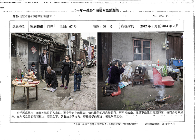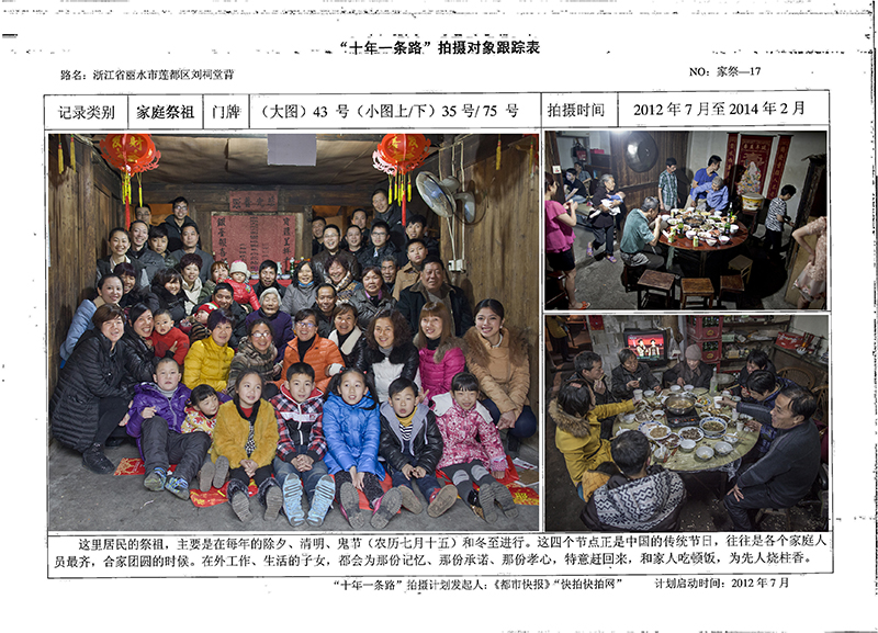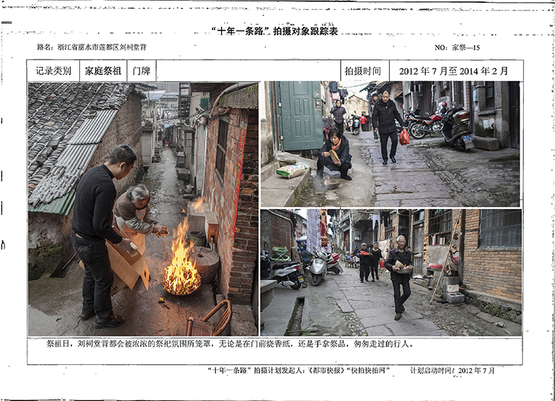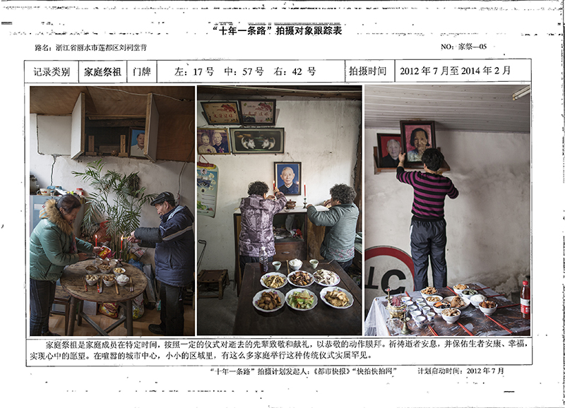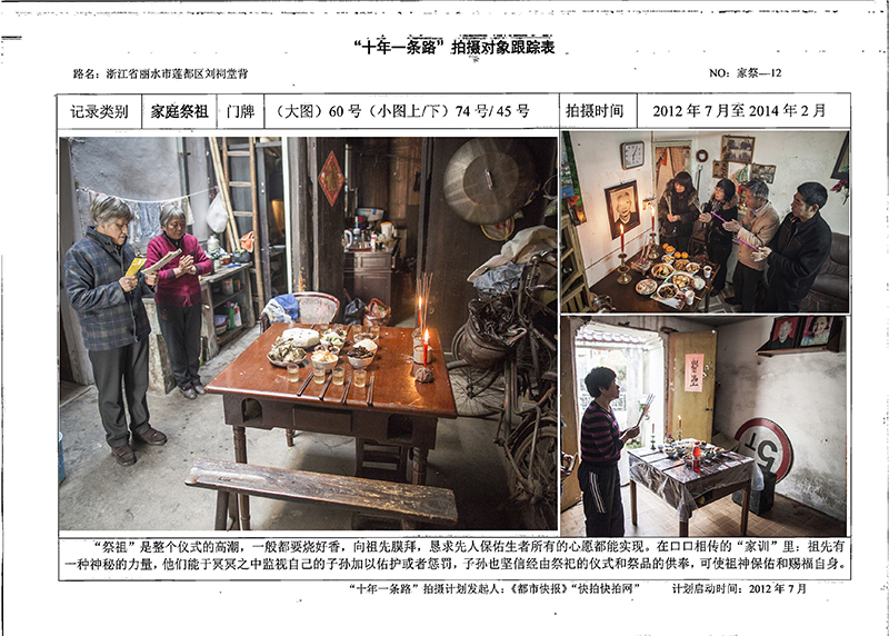 我從2012年開始對麗水劉祠堂背做影像記錄,祭祖活動自然是一個不可或缺的部分。據(jù)統(tǒng)計,在僅有150米長,不足百戶人家的劉祠堂背,有25戶人家,保留著完整的祭祖?zhèn)鹘y(tǒng)。每逢清明節(jié)、中元節(jié)(七月半)、冬至和除夕,這些家庭就會采購上好食品,精心烹飪并備好酒、茶甚至香煙等;安放供桌,擺好香爐,有的還把祖先像、牌位等供于家中上廳。由家長或家庭推舉的人員主祭,通過接祖----供祖----祭祖---送祖四個步驟,完成祭祖儀式。 從我的觀察,這里百姓祭祖出于兩個目的:一是向祖先求福,希望祖先蔭庇子孫,并為子孫解決難處;二是受儒家影響,飲水思源,因孝敬而祭祖。可以說,祭祖儀式是個體與歷史連接的精神臍帶,使今人的身份清晰而神圣。特別是在當(dāng)前,全社會都在倡導(dǎo)重視家庭建設(shè),注重家庭、家教、家風(fēng),發(fā)揚光大中華民族傳統(tǒng)家庭美德的時期。“追遠(yuǎn)”不僅有“民德歸厚”的教化意義,還會讓我們獲得面向未來的力量,確定個體與時代的歷史位置。我們緬懷先人,祭祀先祖,因為他們是自己的來源,他們的辛勞和奮斗乃是我們繼續(xù)前行的起點。這是尊重生命與敬畏歷史的不絕之流。
