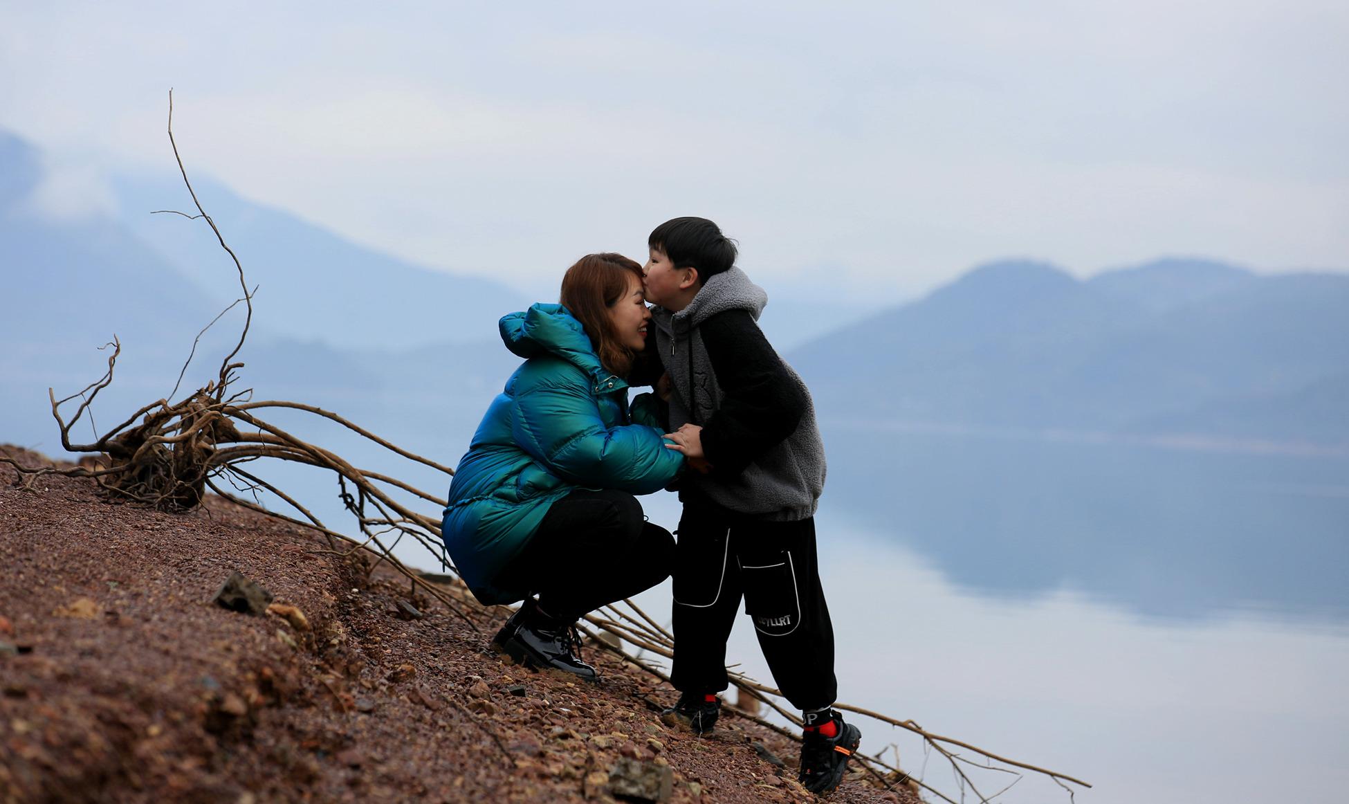 大年初一,酷跑環(huán)長潭湖比賽間隙,一對(duì)跑者親屬在長潭湖邊欣賞湖光山色,此時(shí),小朋友踮起腳尖親吻了一下他的媽媽,我剛好舉起相機(jī)抓拍到這樣的場景瞬間