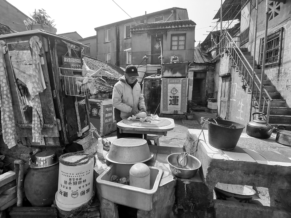 (組照十六)2018年9月,戚繼光路,一早上在家門口清洗馬桶的女人。老城區(qū)還有不少家庭,沒有安裝抽水馬桶,只能沿用古老的馬桶。