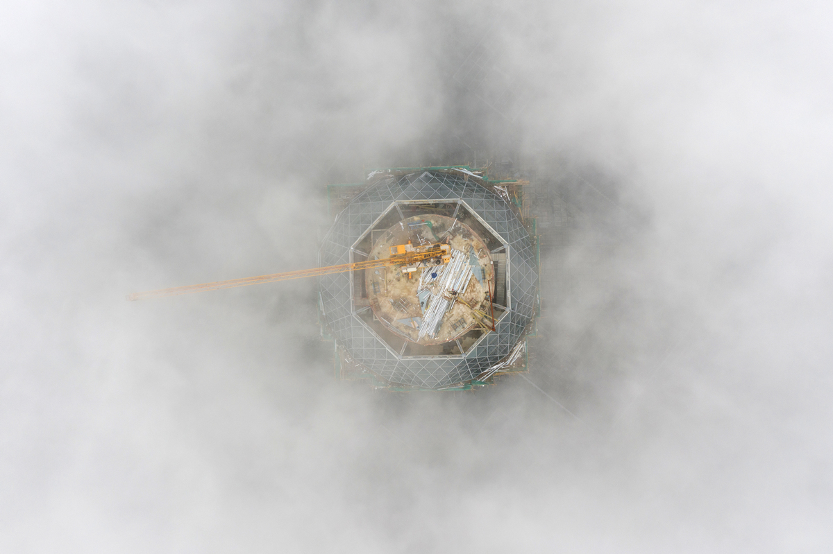 施工中的臺州第一高樓天盛中心,仿佛要沖出云端。