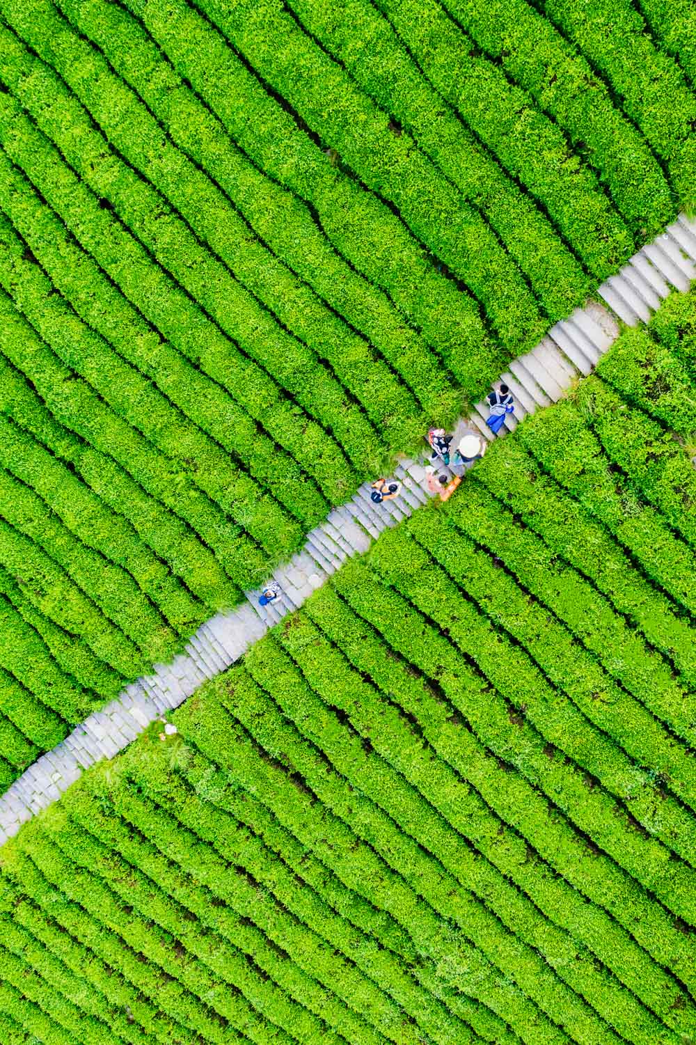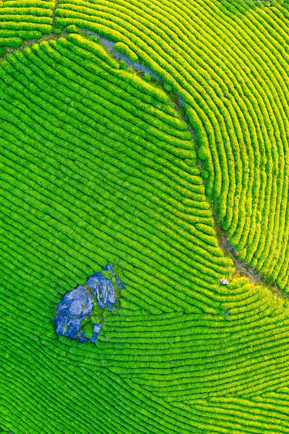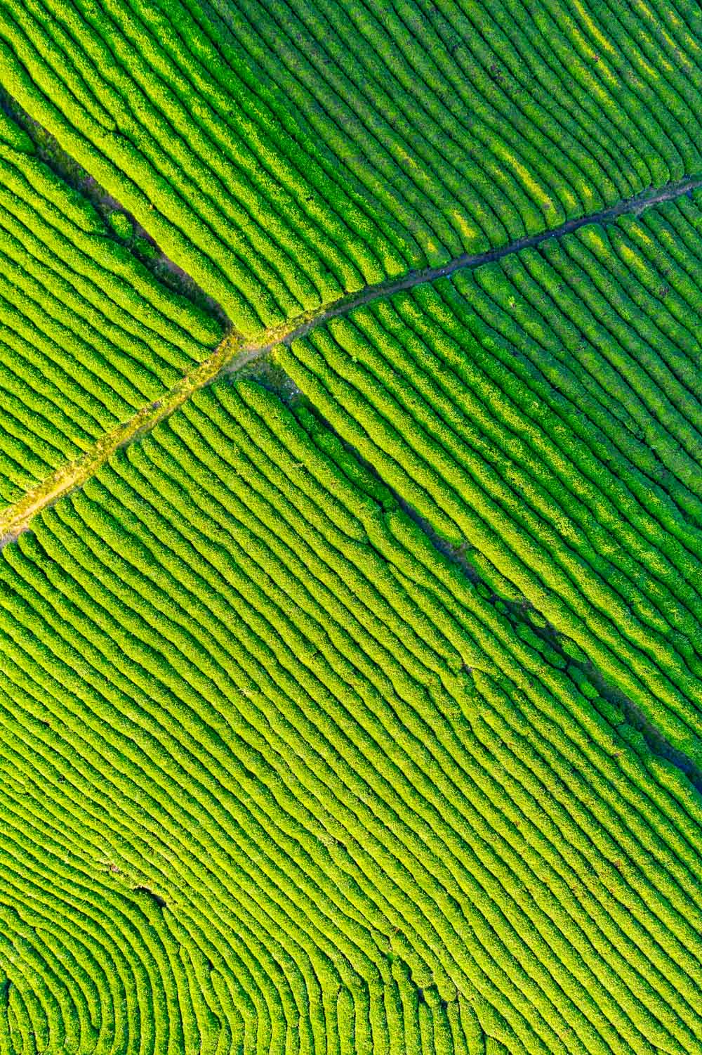 作品介紹: 在浙江中諸暨、嵊州、東陽(yáng)三地交界處的東白山山頂,圍繞著頂峰分布著大片茶園,夏日的茶園在斜斜夕陽(yáng)之下,呈現(xiàn)與眾不同又令人舒暢的質(zhì)感尤其在使用無人機(jī)垂直俯瞰這片茶園的時(shí)候。