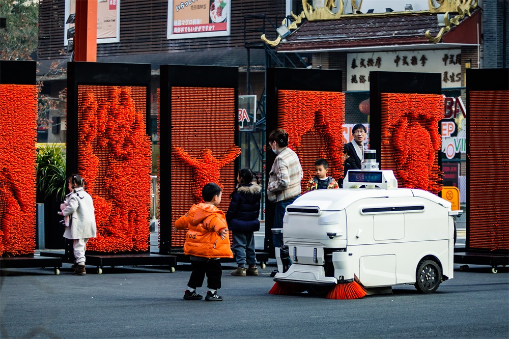 返回頂部>> 照片說明: 耀達(dá)路上的掃地機(jī)器人吸引了小朋友的興趣。