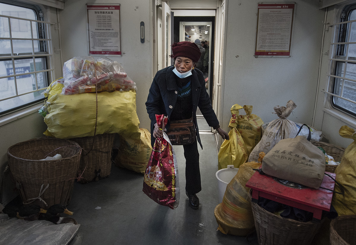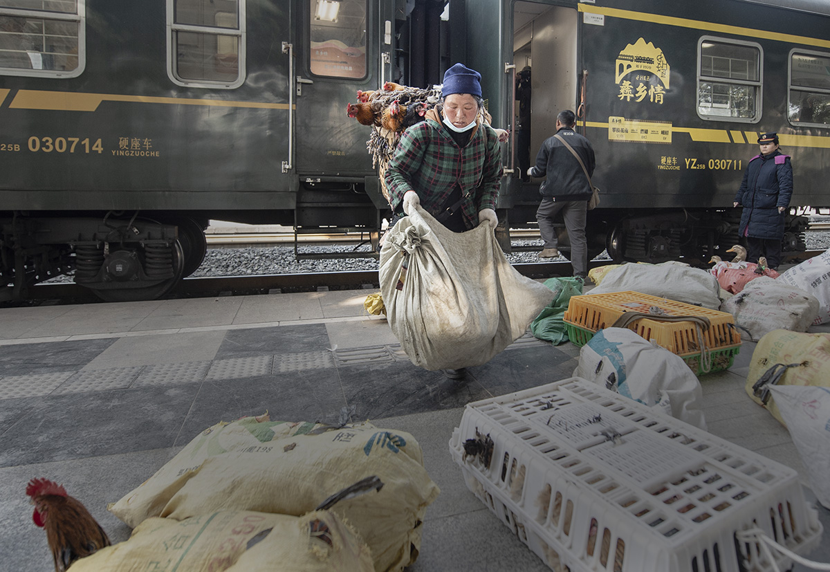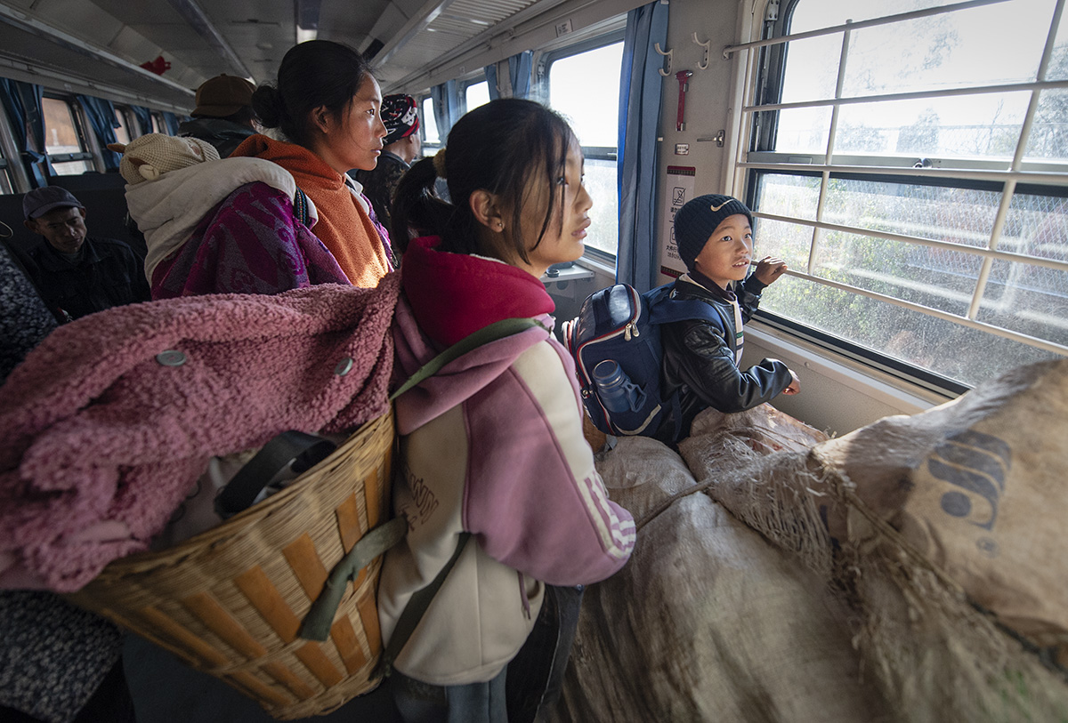 近年,國家加大了對大涼山彝族同胞的支持力度,開通了專用的扶貧列車線路。作品展示了彝族同胞日常在扶貧列車上的場景。