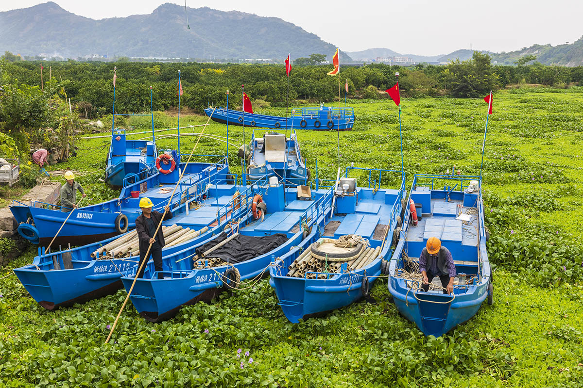 2023年10月11日,臨海桃渚的漁民們因河流中的水葫蘆睹塞,導(dǎo)致魚船無法出海,漁民感到困域。