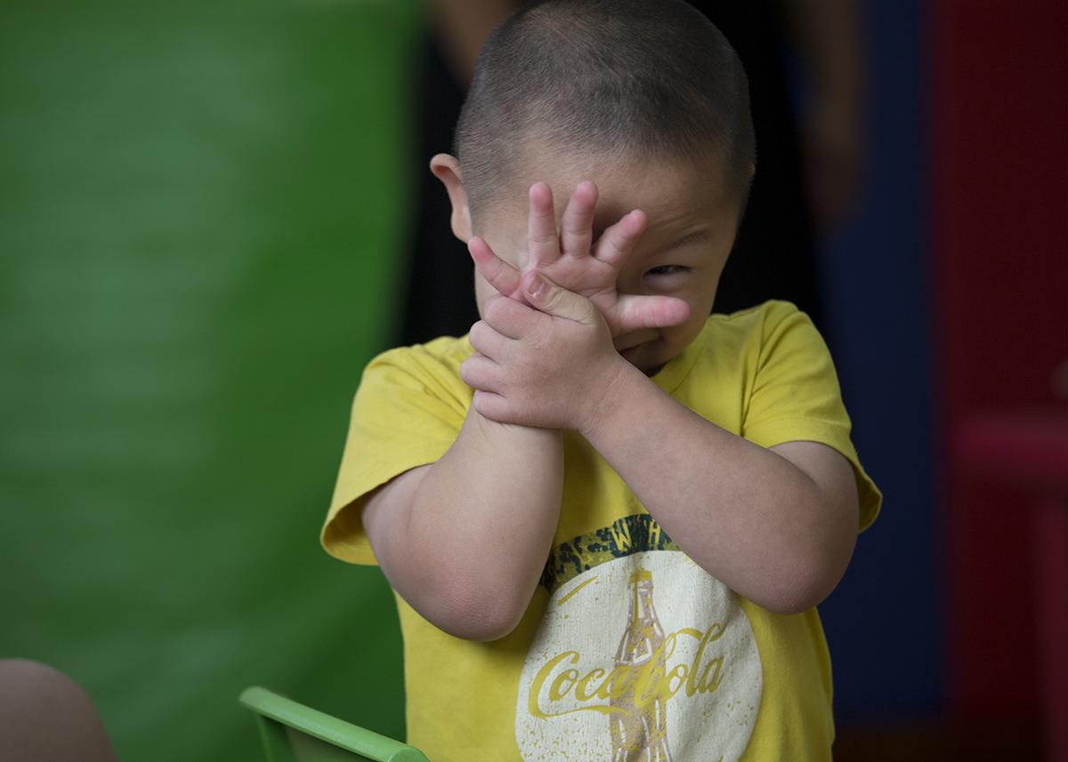 作品介紹: 沈楊,2013年10月出生在臨海永豐鎮(zhèn),家里有個大他13歲的姐姐。母親多年求子,吃了好多年的藥,以至他出生后就發(fā)現(xiàn)不一樣,經(jīng)醫(yī)院檢查多了一條染色體,圓圓的臉,呆滯的目光,屬于典型的唐氏綜合癥。走路比同齡小朋友晚了好多年,身體冬天熱,夏天冷,前后生病康復(fù)化了十幾萬。目前11歲的沈楊在臨海特殊學(xué)校讀書,生活基本可以自理,對音樂比較敏感,喜歡玩具,唱歌。父母對兒子今后的生活也表示迷茫。中國唐氏綜合征發(fā)病率為1/800,希望社會都來關(guān)心這批特殊的兒童,讓他們今后能自食其力,創(chuàng)造個人價值。