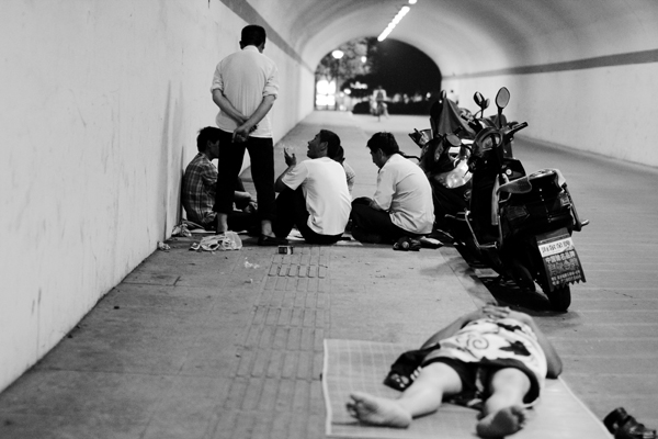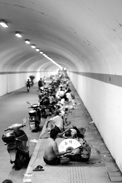 新避暑圣地2012年7月7日;浙江杭州;當外面是38度時,這里是28度;當外面是人煙罕至的深夜時,這里還如集市般熱鬧。在這里,有人過夜睡覺、有人休閑娛樂;在這里,有孤身一人的、有舉家前來的。然,在這里,外來務工人員還是占了多數。這里,是一個穿山隧道。