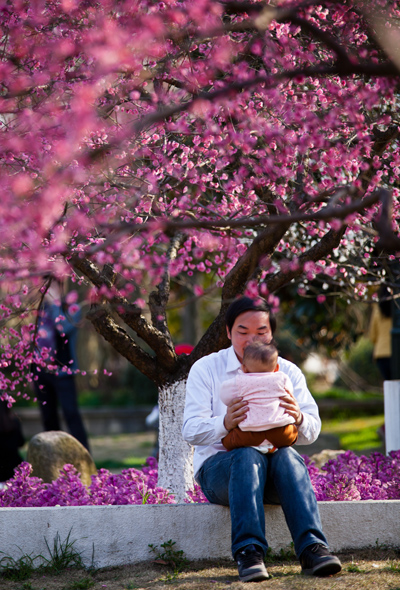 2012年3月24日拍攝于杭州植物園靈峰、周末放晴了,植物園百花齊放,一片片紅綠。爸抱著小寶貝在一片美麗的花海下享受久違的陽光