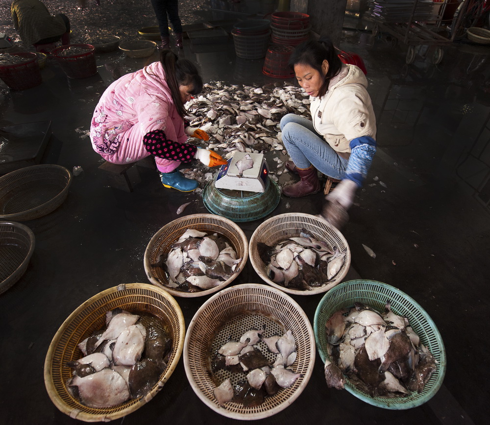 漁業加工廠里的工人們兢兢業業地工作,對產品進行挑選、分類。