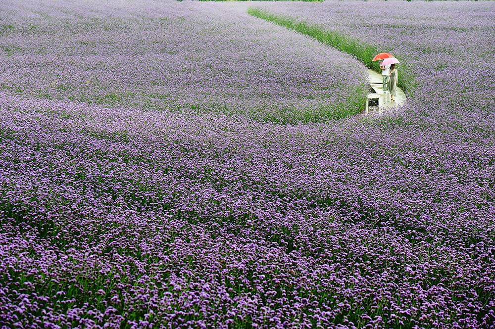 城南寨門種植了98畝柳葉馬鞭草,正值盛開時節。