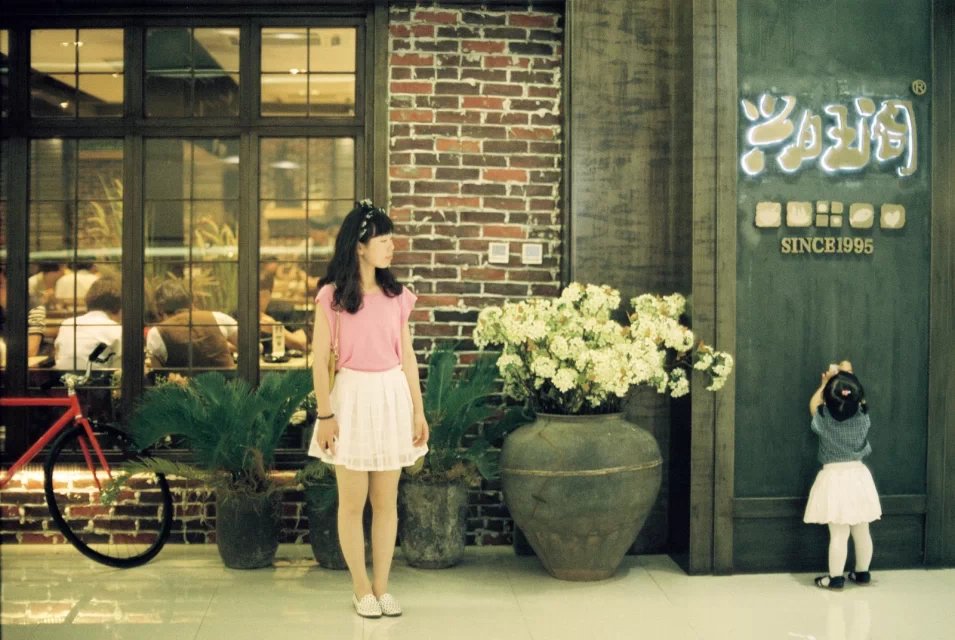 返回頂部>> 照片說明:  圖為一對母女正在溫嶺銀泰城的興旺閣面館前游玩。(膠片機拍攝)