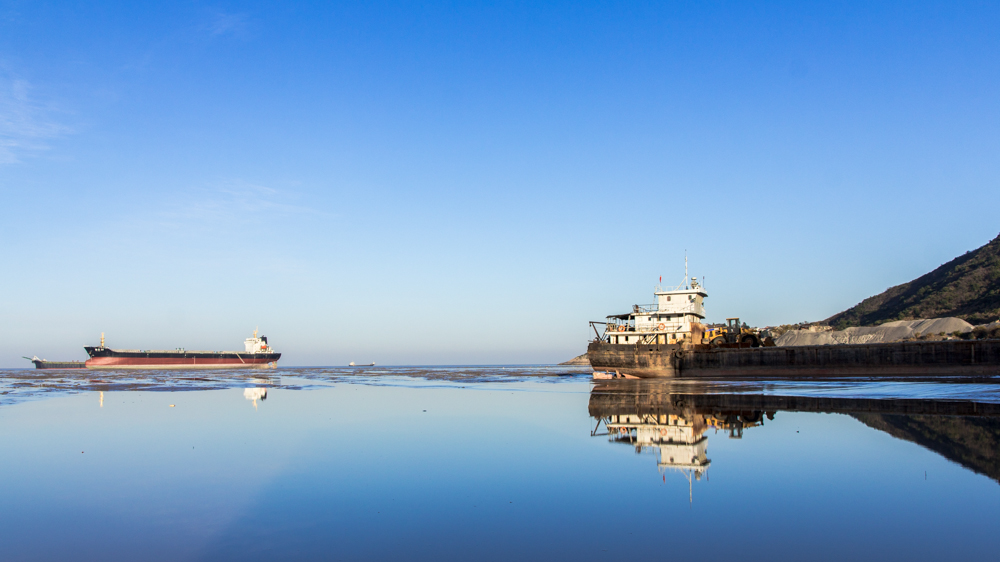 海邊運沙船停靠在岸邊,等待沙子裝船