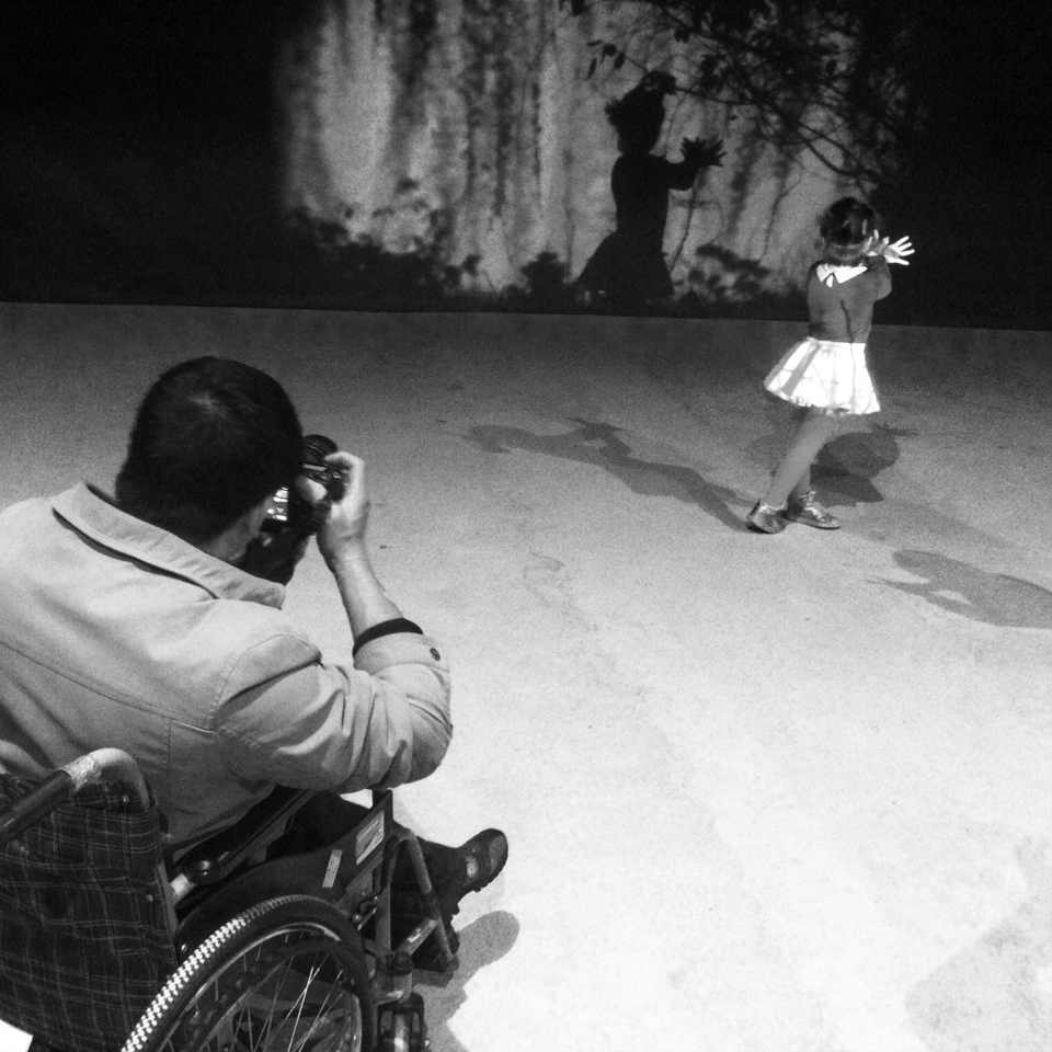 11月9日,上午,臺州科技館,12人論壇會桌旁邊,一個小影迷在幻燈機前玩手影,引來影友駐足。