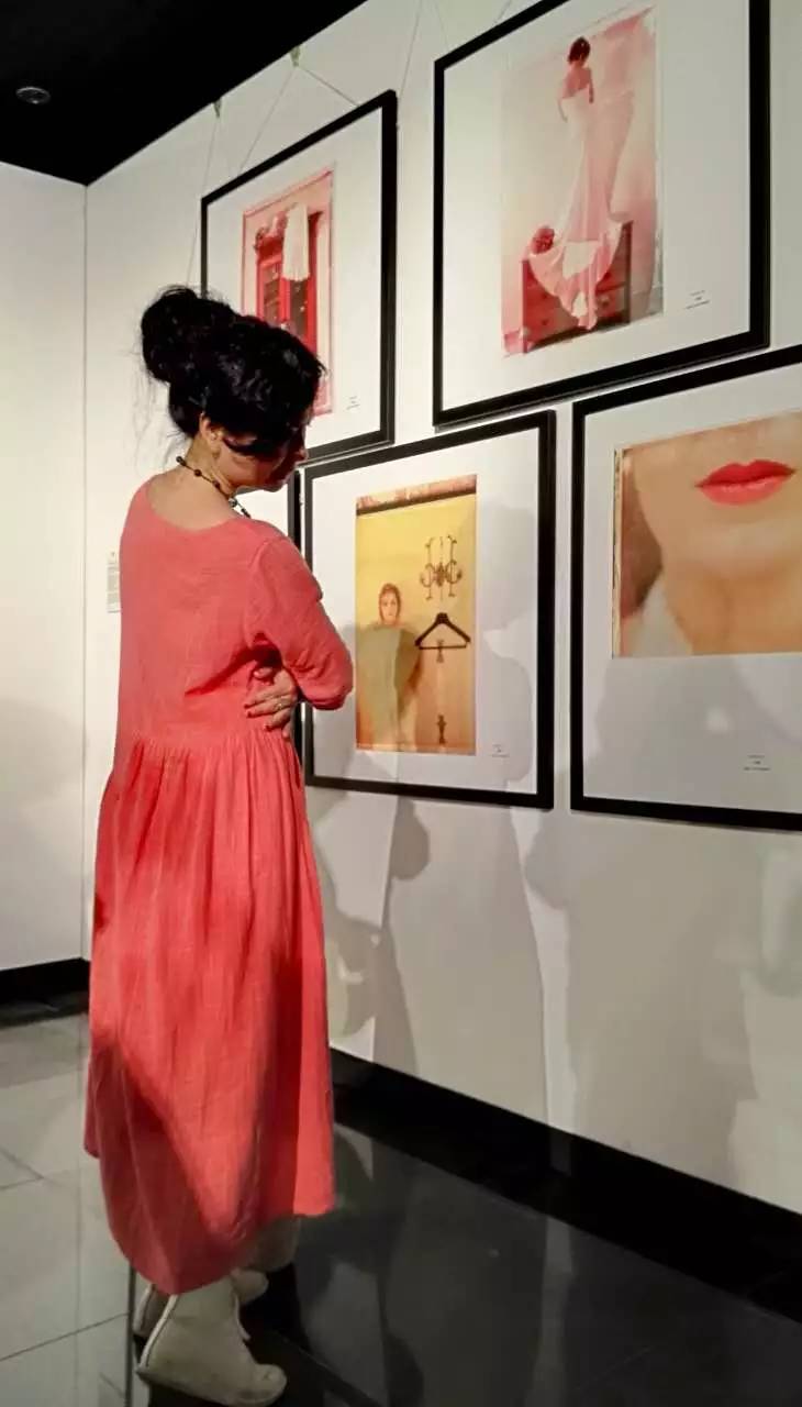 2015.11.8麗水美術館展區,一位婦女模仿照片中模特的pos,喻示愛健康,愛時尚。