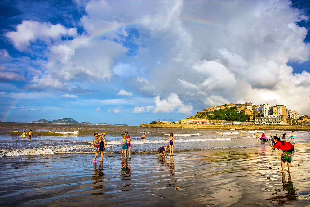 夏日的金沙灘上出現(xiàn)了美麗的彩虹,非常的漂亮。