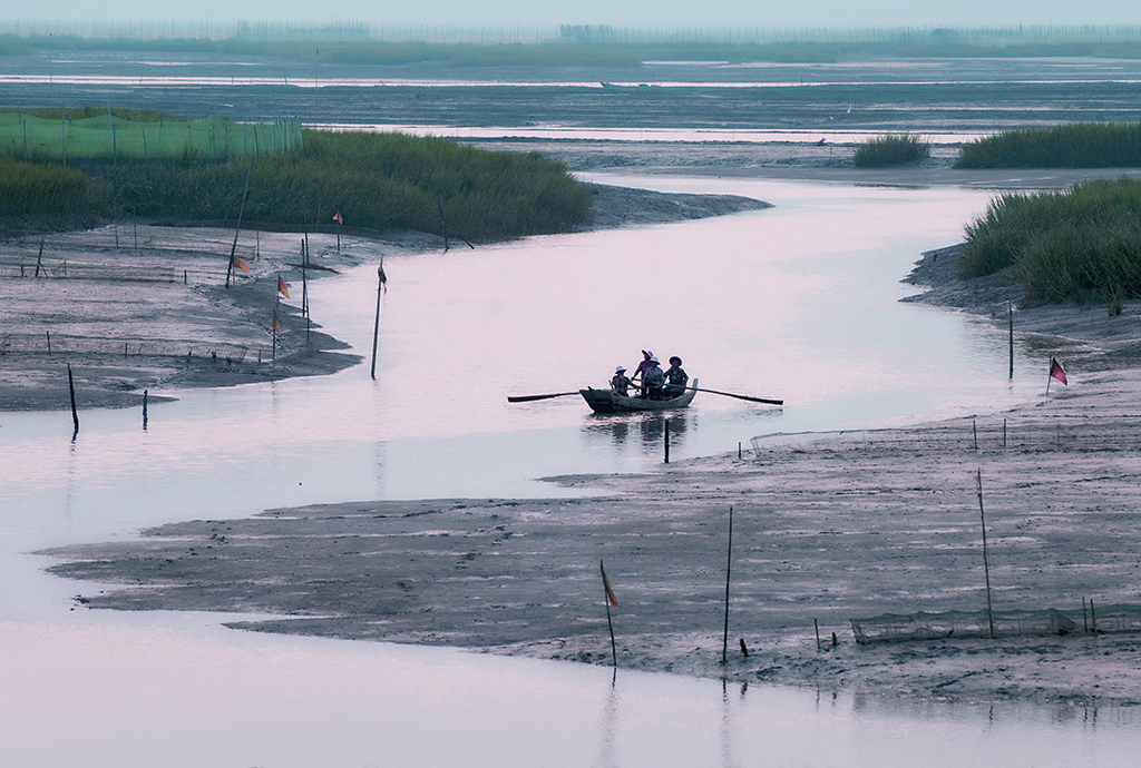 作品介紹: 暮色中,一艘手劃漁舟從海溝盡頭徐徐搖向岸邊,起早貪黑的漁民結(jié)束了一天的灘涂勞作。