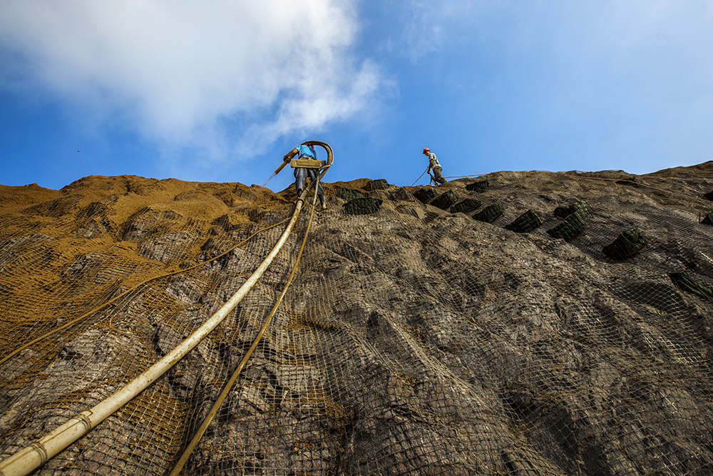 作品介紹: 隨著科學(xué)技術(shù)的突飛猛進(jìn),人類獲得了巨大的開發(fā)和利用大自然的能力,他們?cè)谫囈陨娴耐恋厣祥_山辟地,筑路架橋,修房建廠……這些大型工程為人類提供了更加便利的生活條件,同時(shí)也破壞了大自然原有的生態(tài)平衡。公路、 鐵路、 水利、電力、礦山等工程建設(shè)過程中經(jīng)常要大量挖方、填方,對(duì)山體造成了大量的裸露邊坡并帶來一系列環(huán)境問題,如水土流失、滑坡、泥石流、局部小氣候的惡化及生物鏈的破壞等。這些工程所形成的陡峭的巖石邊坡,若只靠自然界自身的力量恢復(fù),將需要漫長(zhǎng)的時(shí)間,往往會(huì)留下永久的傷痕。因此必須采取必要的工程措施,對(duì)邊坡進(jìn)行人工綠化。這是減少生態(tài)災(zāi)害、環(huán)境保護(hù)的需要, 也是《水土保持法》所規(guī)定的。本組照片通過介紹2018年溫嶺市人民政府在治理太平街道北山邊坡修復(fù)施工作業(yè)中的一些人和事,展現(xiàn)近年來政府和社會(huì)群體在治理城市生態(tài)環(huán)境中的成果縮影。