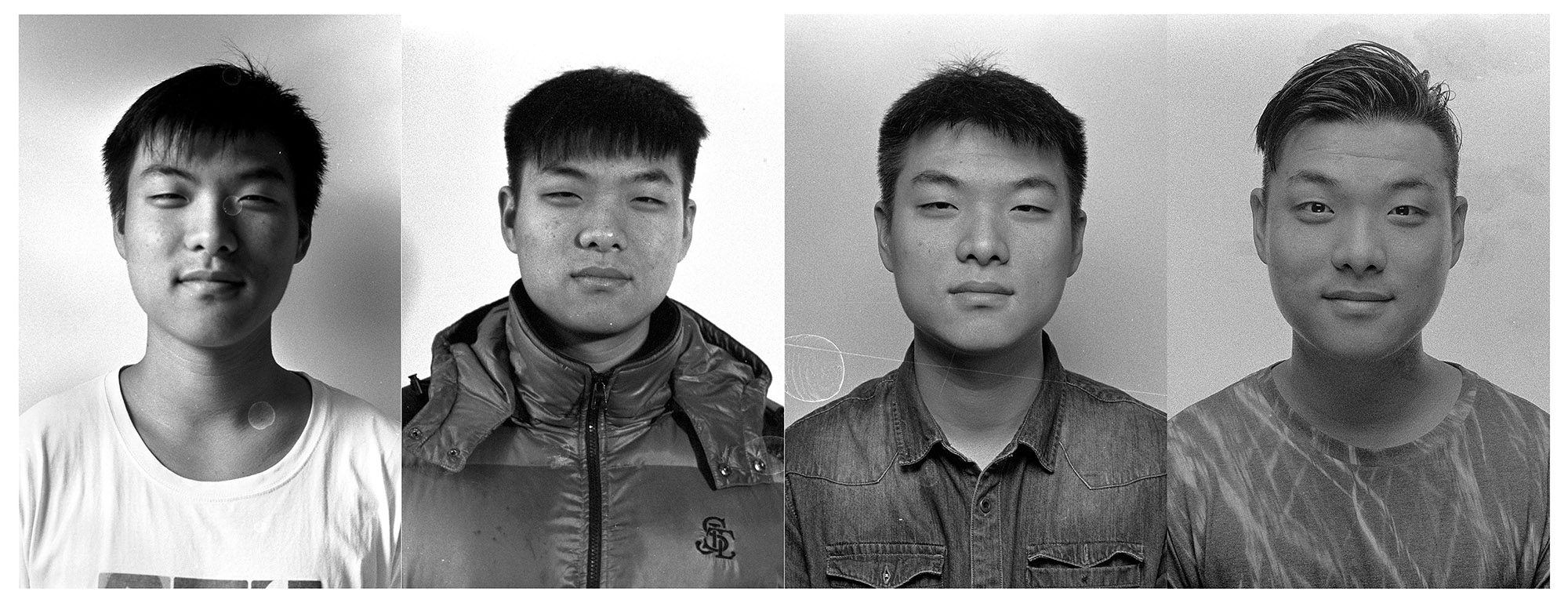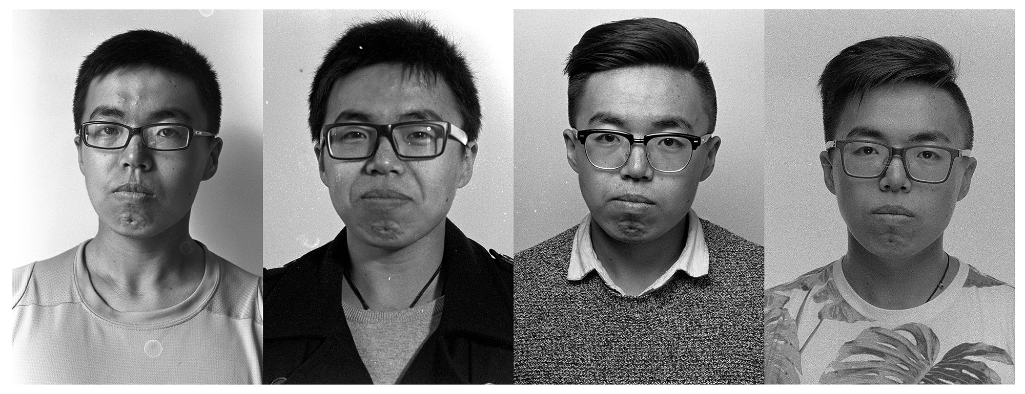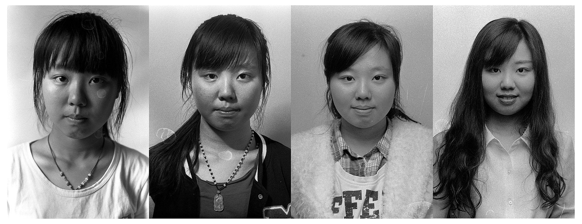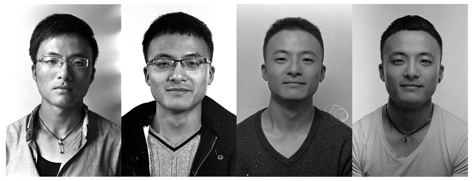 作品介紹: 我是2012級(jí)攝影1班的班主任。這組作品的拍攝方法是,每年我給他們拍一張頭像,然后按年份從左到右并列排版。最初的想法是,我想看看大學(xué)對(duì)一個(gè)人有什么樣的改變?我采取了這樣簡(jiǎn)單,但是也有效的辦法。一個(gè)人的改變,重要的體現(xiàn)在臉上,而特別的是神態(tài)、眼神上。所以我拍攝了頭像。采用膠卷拍攝,掃描后裁剪出頭像拼置而成。對(duì)影像只做裁剪,有些水漬和劃痕如果影響五官的就處理了,其余保持原狀。另外也調(diào)整了明暗。
