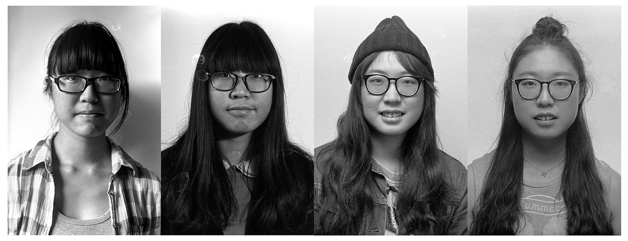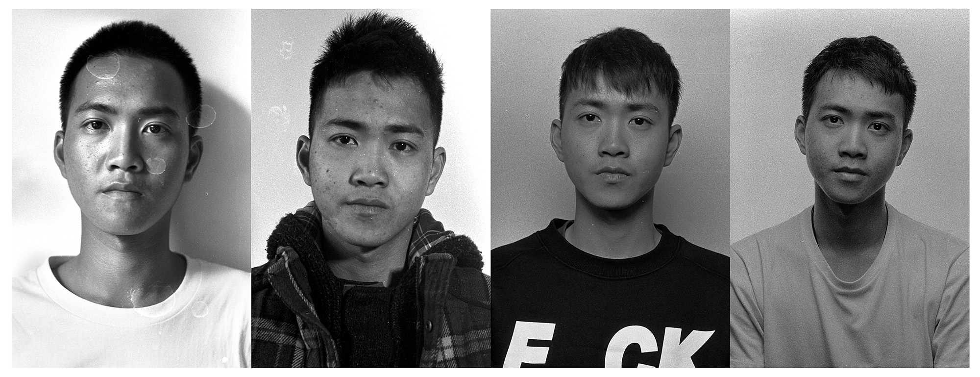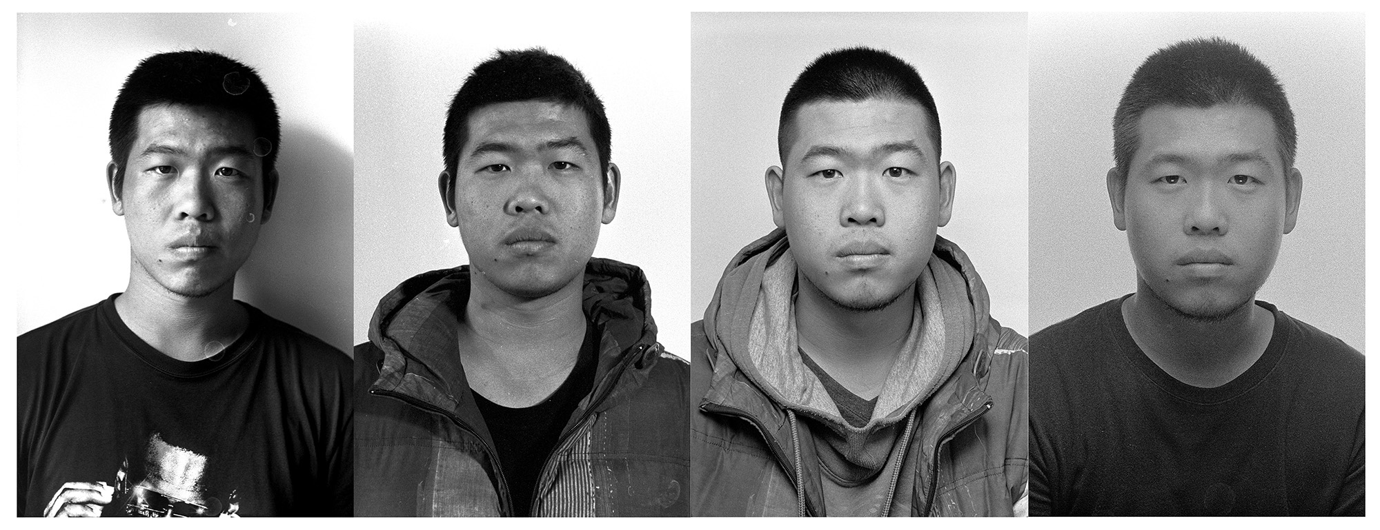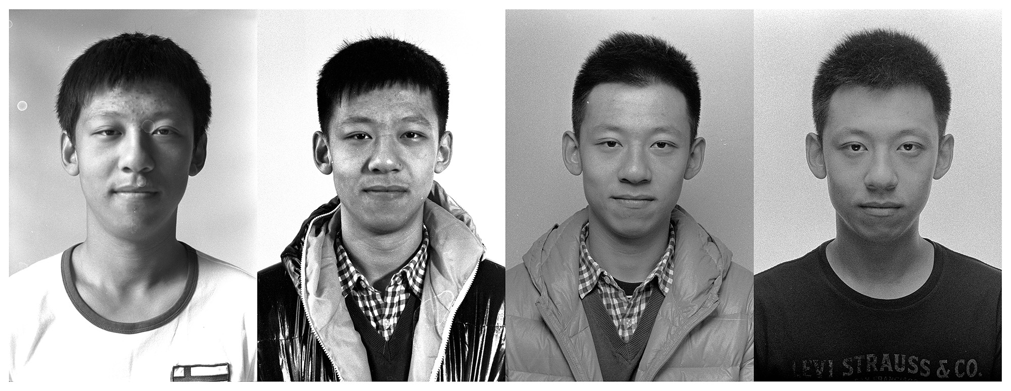 作品介紹: 我是2012級(jí)攝影1班的班主任。這組作品的拍攝方法是,每年我給他們拍一張頭像,然后按年份從左到右并列排版。最初的想法是,我想看看大學(xué)對(duì)一個(gè)人有什么樣的改變?我采取了這樣簡(jiǎn)單,但是也有效的辦法。一個(gè)人的改變,重要的體現(xiàn)在臉上,而特別的是神態(tài)、眼神上。所以我拍攝了頭像。采用膠卷拍攝,掃描后裁剪出頭像拼置而成。對(duì)影像只做裁剪,有些水漬和劃痕如果影響五官的就處理了,其余保持原狀。另外也調(diào)整了明暗。