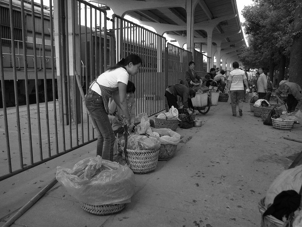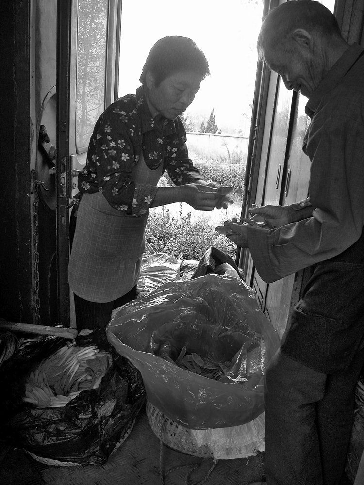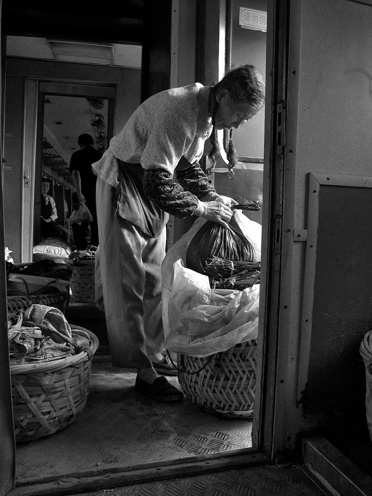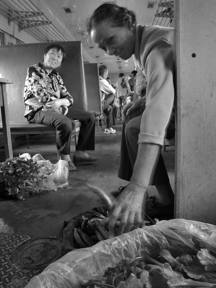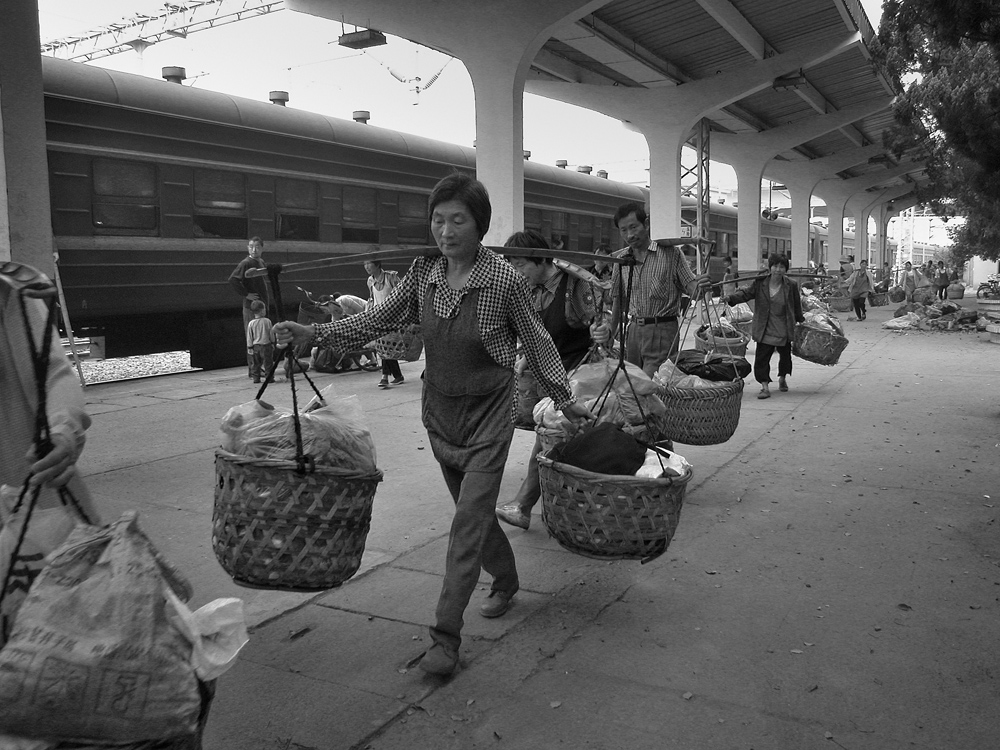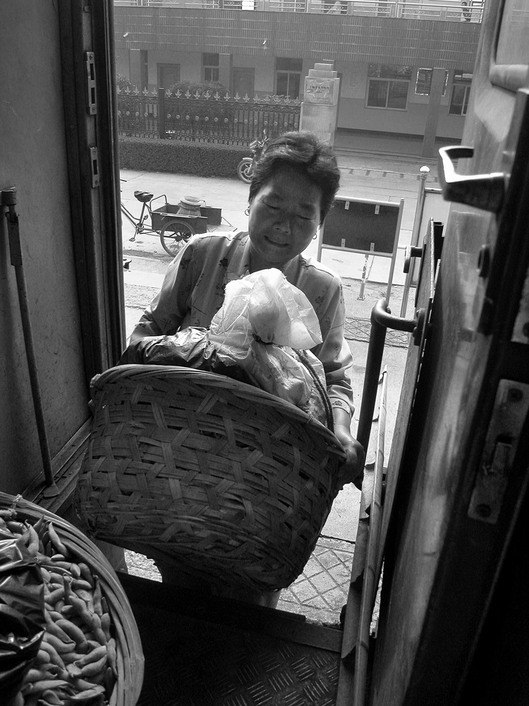 作品介紹: 在杭州以北20公里有這樣一個地方喬司鎮(zhèn),那里有許多以種菜為主的菜農(nóng),過去為去杭城農(nóng)貿(mào)市場賣菜煩惱過,菜農(nóng)們只有踩著三輪車去賣菜。杭州鐵路分局為了與當?shù)氐霓r(nóng)民搞好“魚水情”的關系,允許這些菜農(nóng)們乘坐鐵路職工上下班的火車到杭州去賣菜,為當?shù)氐牟宿r(nóng)們帶來的方便,這樣菜農(nóng)們每天早上8:00坐這趟車,經(jīng)過50分鐘,車到到杭州艮山門車站,菜農(nóng)們把菜挑到“杭州文暉農(nóng)貿(mào)果品市場”去賣。當?shù)氐木用褚卜浅O矚g他們帶來的瓜果蔬菜,一則很新鮮,二則價格低廉。不到一小時就全部賣完,到中午11:00菜農(nóng)們挑著空筐重新坐上這趟車回家,日復一日,年復一年。由于鐵路進入了高鐵時代,從安全角度考慮,在2010年已經(jīng)取消了這項業(yè)務。這組片子拍攝于2006年10月,地點:杭州市。