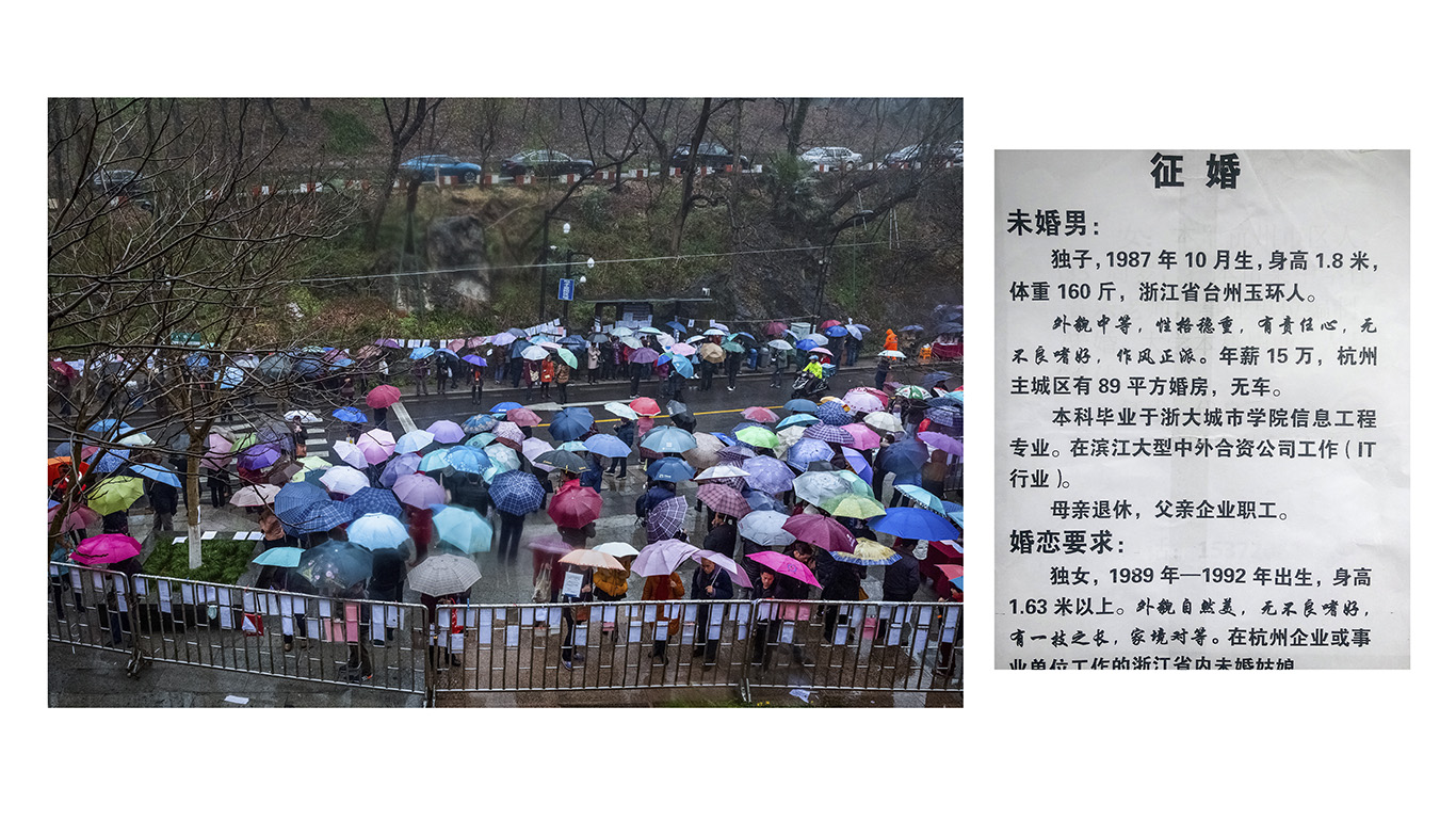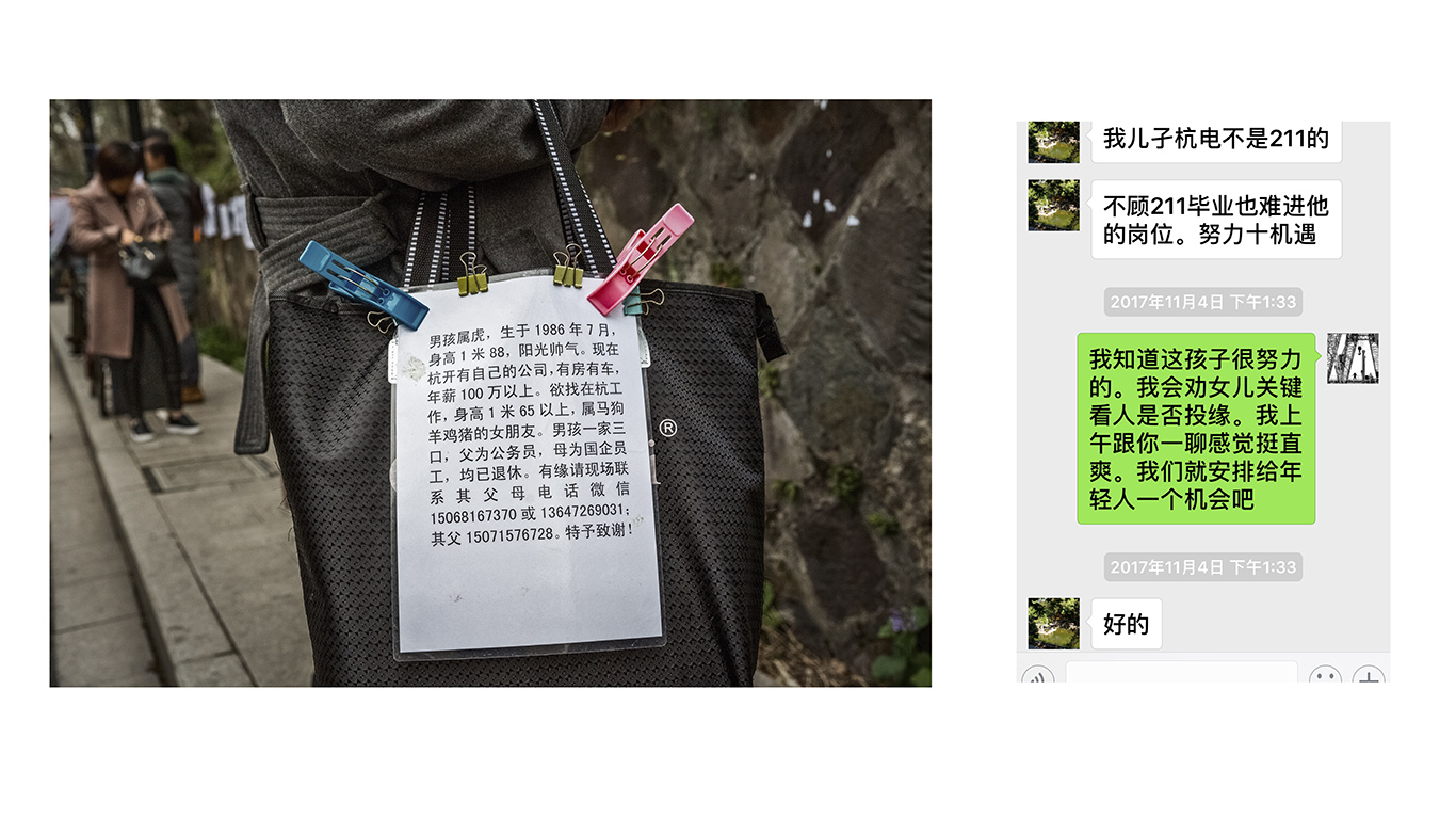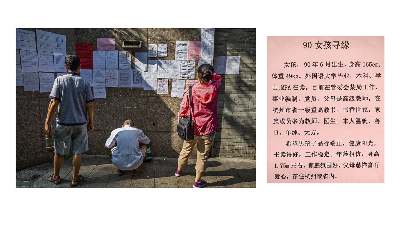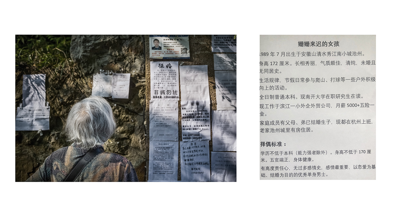 本專題取材于杭州萬松書院的公益相親角,它是全國各地相親隊(duì)伍中的一個(gè)縮影,而且這股勢(shì)頭有過之而不及。我用報(bào)道紀(jì)實(shí)的拍攝手法,每幅圖片拼置一張相親廣告或者家長(zhǎng)微信記錄讓整個(gè)事件表現(xiàn)得淋漓盡致。一邊家長(zhǎng)的對(duì)子女婚姻成功的迫切需求,一邊是子女的被動(dòng)相親。家長(zhǎng)的相親行為是否得到子女的認(rèn)同?家長(zhǎng)選中的兒女能否接納?