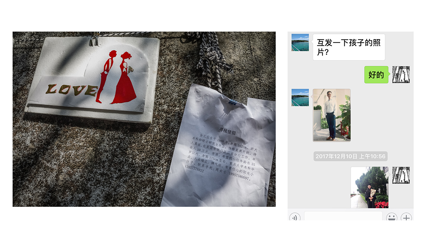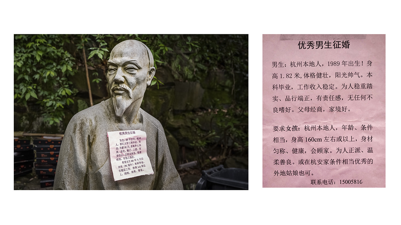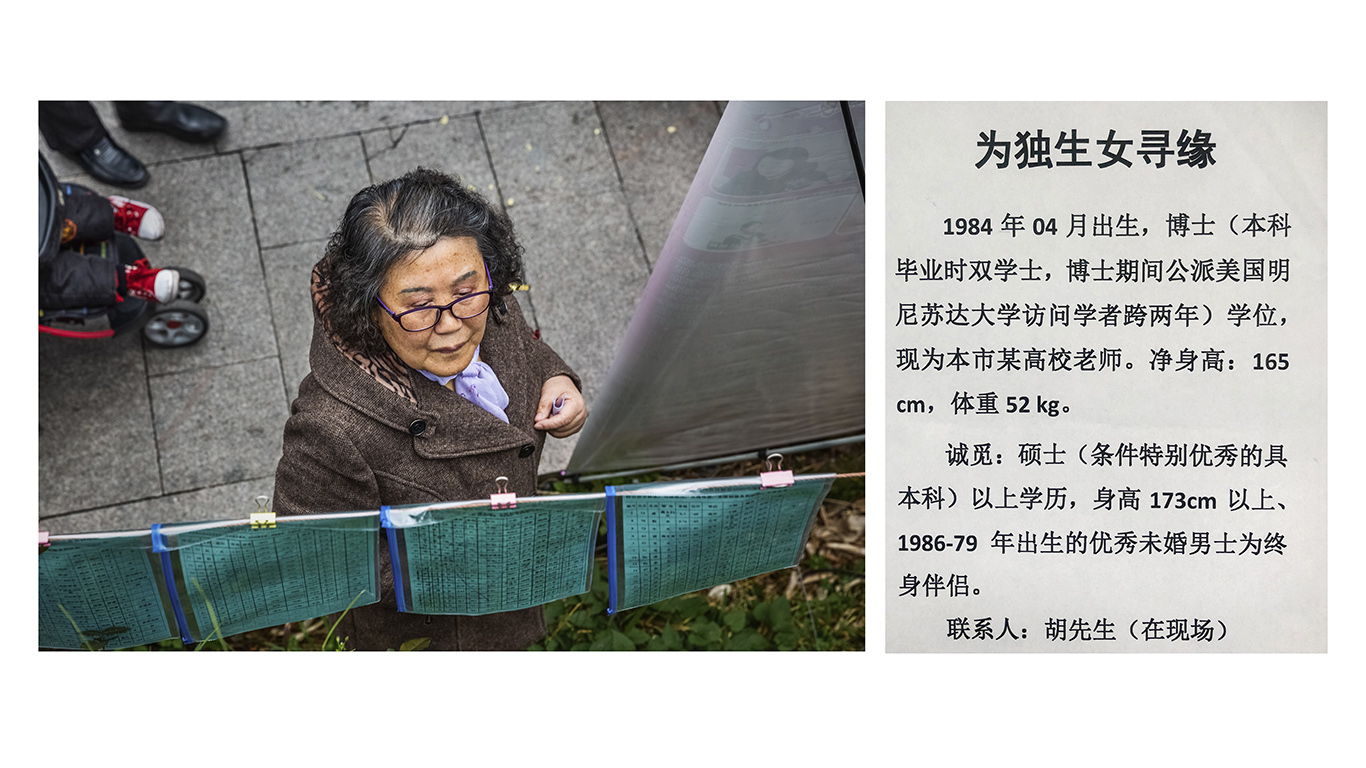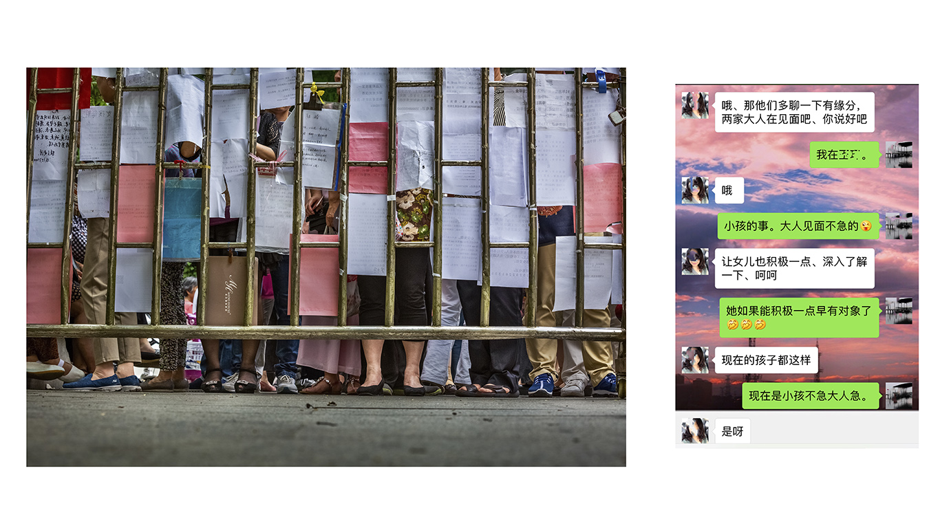 本專題取材于杭州萬松書院的公益相親角,它是全國各地相親隊(duì)伍中的一個(gè)縮影,而且這股勢(shì)頭有過之而不及。我用報(bào)道紀(jì)實(shí)的拍攝手法,每幅圖片拼置一張相親廣告或者家長(zhǎng)微信記錄讓整個(gè)事件表現(xiàn)得淋漓盡致。一邊家長(zhǎng)的對(duì)子女婚姻成功的迫切需求,一邊是子女的被動(dòng)相親。家長(zhǎng)的相親行為是否得到子女的認(rèn)同?家長(zhǎng)選中的兒女能否接納?