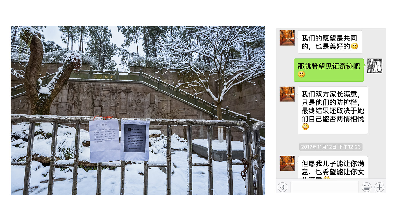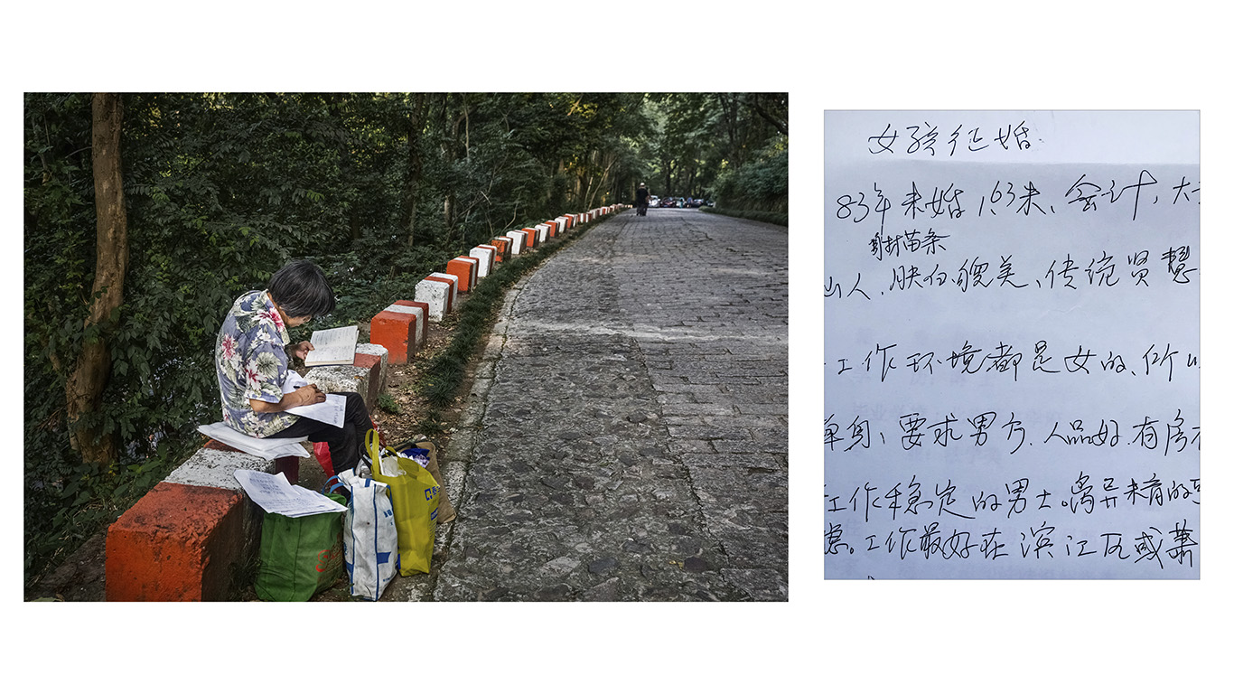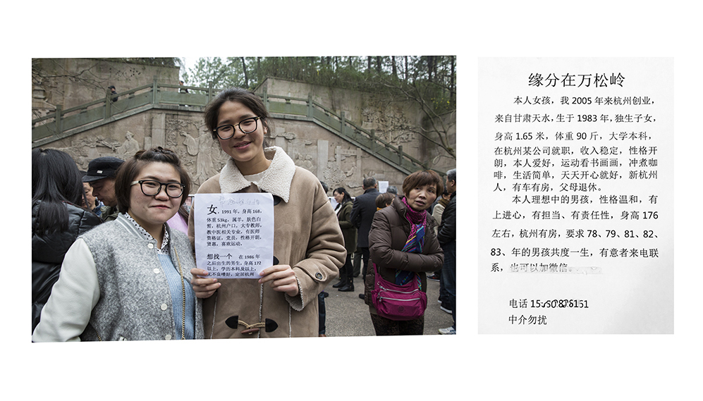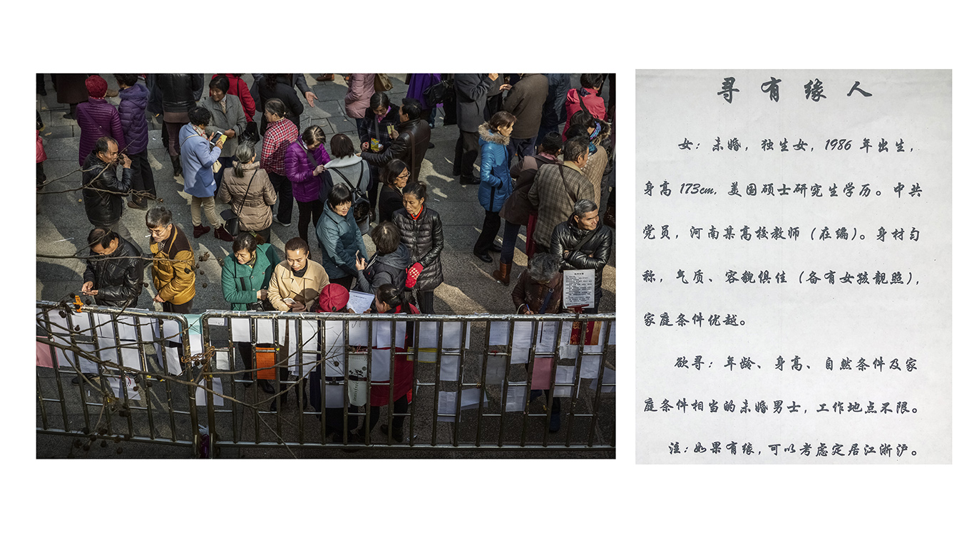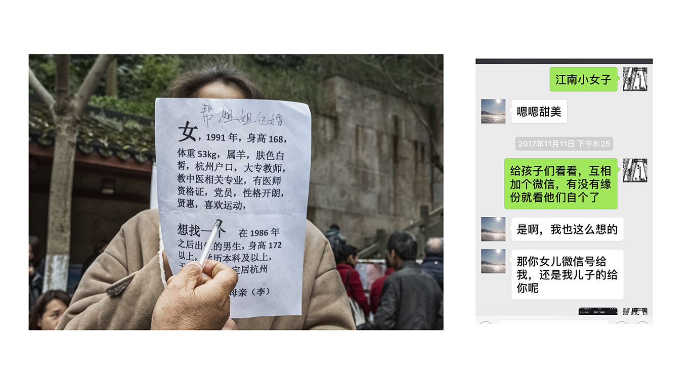 本專題取材于杭州萬松書院的公益相親角,它是全國各地相親隊(duì)伍中的一個(gè)縮影,而且這股勢(shì)頭有過之而不及。我用報(bào)道紀(jì)實(shí)的拍攝手法,每幅圖片拼置一張相親廣告或者家長(zhǎng)微信記錄讓整個(gè)事件表現(xiàn)得淋漓盡致。一邊家長(zhǎng)的對(duì)子女婚姻成功的迫切需求,一邊是子女的被動(dòng)相親。家長(zhǎng)的相親行為是否得到子女的認(rèn)同?家長(zhǎng)選中的兒女能否接納?