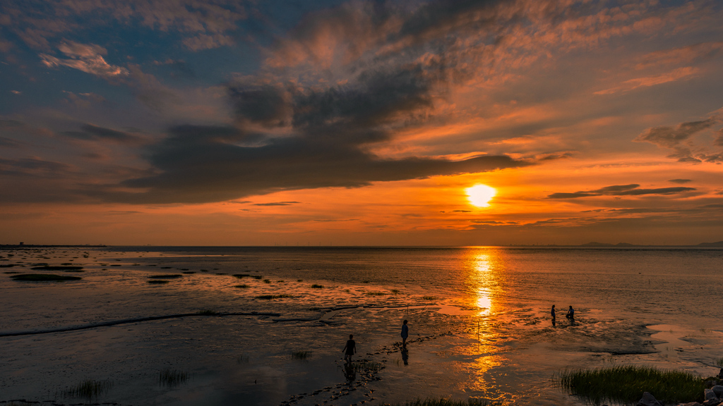 作品介紹: 夏季的余姚市泗門(mén)鎮(zhèn)杭州灣海岸線上,太陽(yáng)即將下山,白云在陽(yáng)光的照射中變黑了,像一只黑色的天鵝在天空飛翔,遠(yuǎn)處的海涂上趕海的人們還在忙綠。