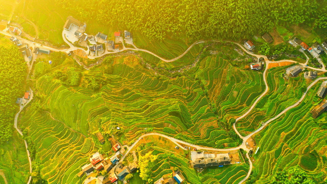 提倡保護生態(tài),就地取材,發(fā)展新農(nóng)村。隨著生活水平的提升,很多人愿意去鄉(xiāng)下感受農(nóng)村的慢節(jié)奏,欣賞農(nóng)村的美景!照片中俯瞰在海拔近500米的農(nóng)村中,隨著早晨第一縷陽光的照射更加美麗