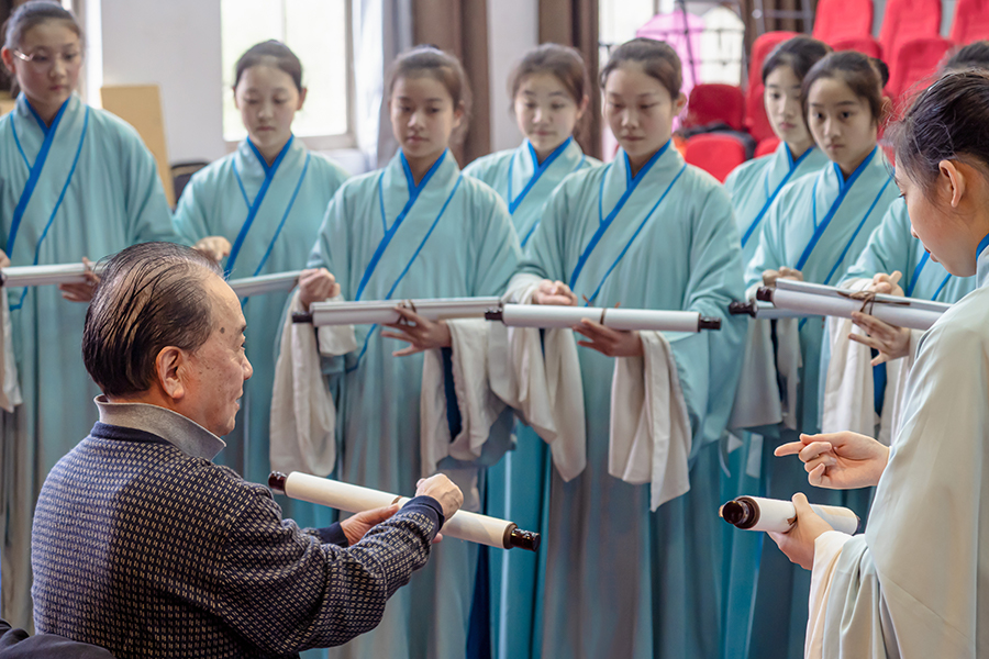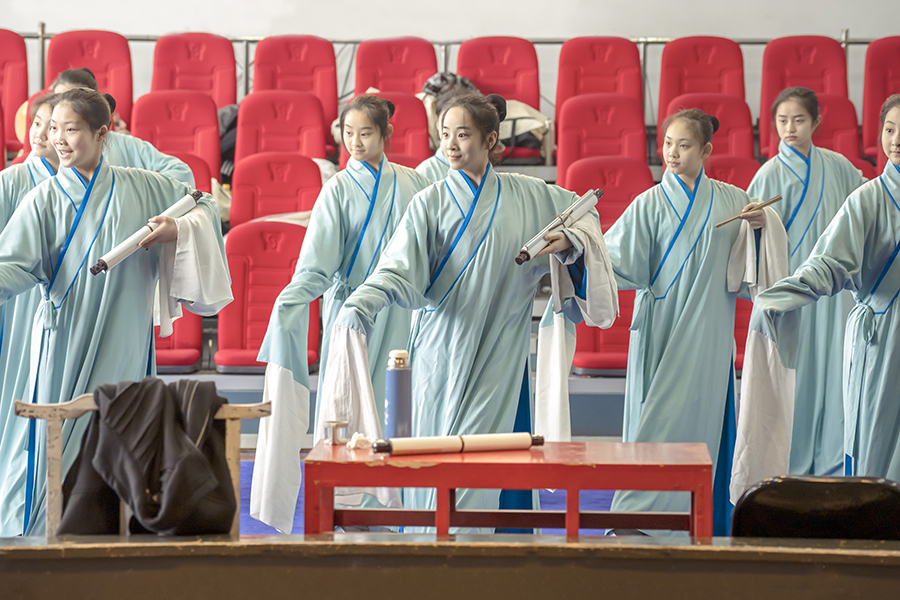 “剛開(kāi)始就研讀劇本,然后去這個(gè)了解人物,剖析人物情感。坐排完了就是上舞臺(tái)排練。老師一遍一遍的扣細(xì)節(jié)再對(duì)燈光” “會(huì)有聯(lián)排,響排,彩排,最后演出。”演出時(shí)陳子心陳可心姐妹倆的走位與細(xì)節(jié)總是那么完美,在這些完美背后是一遍又一遍的踩點(diǎn)、復(fù)排。古典戲曲藝術(shù)深入少年生活,更是為未來(lái)的戲曲人才培養(yǎng)做準(zhǔn)備。