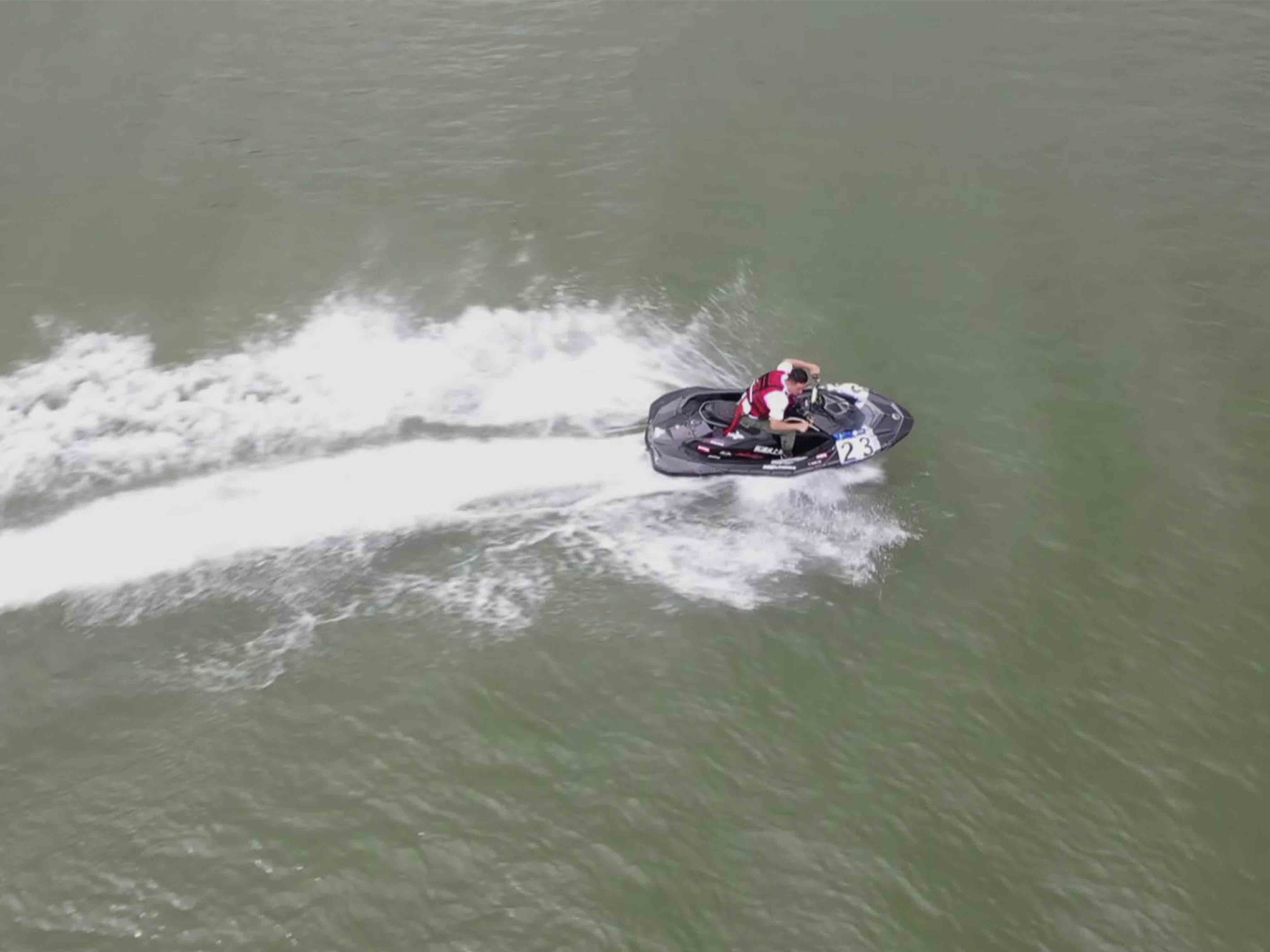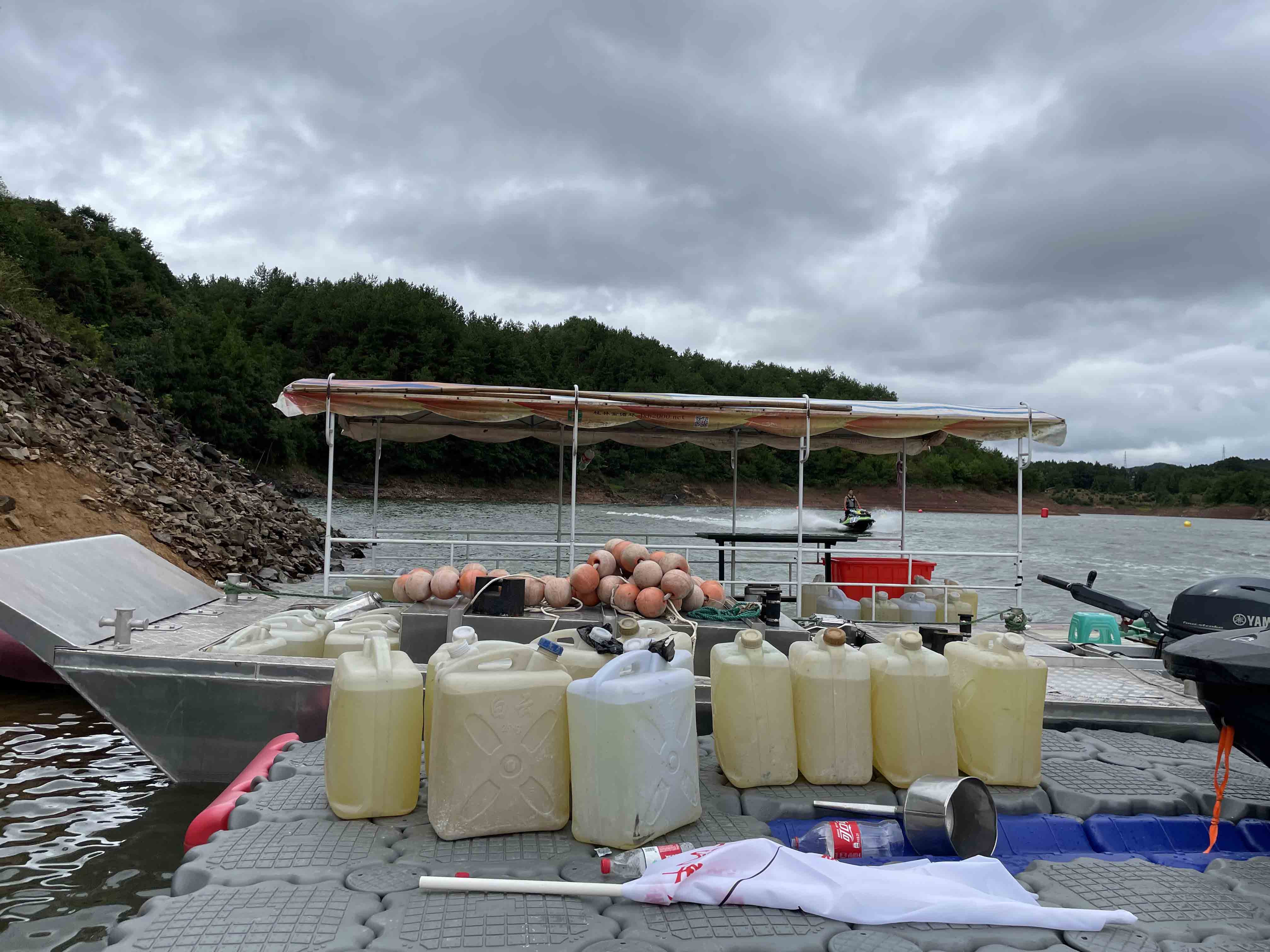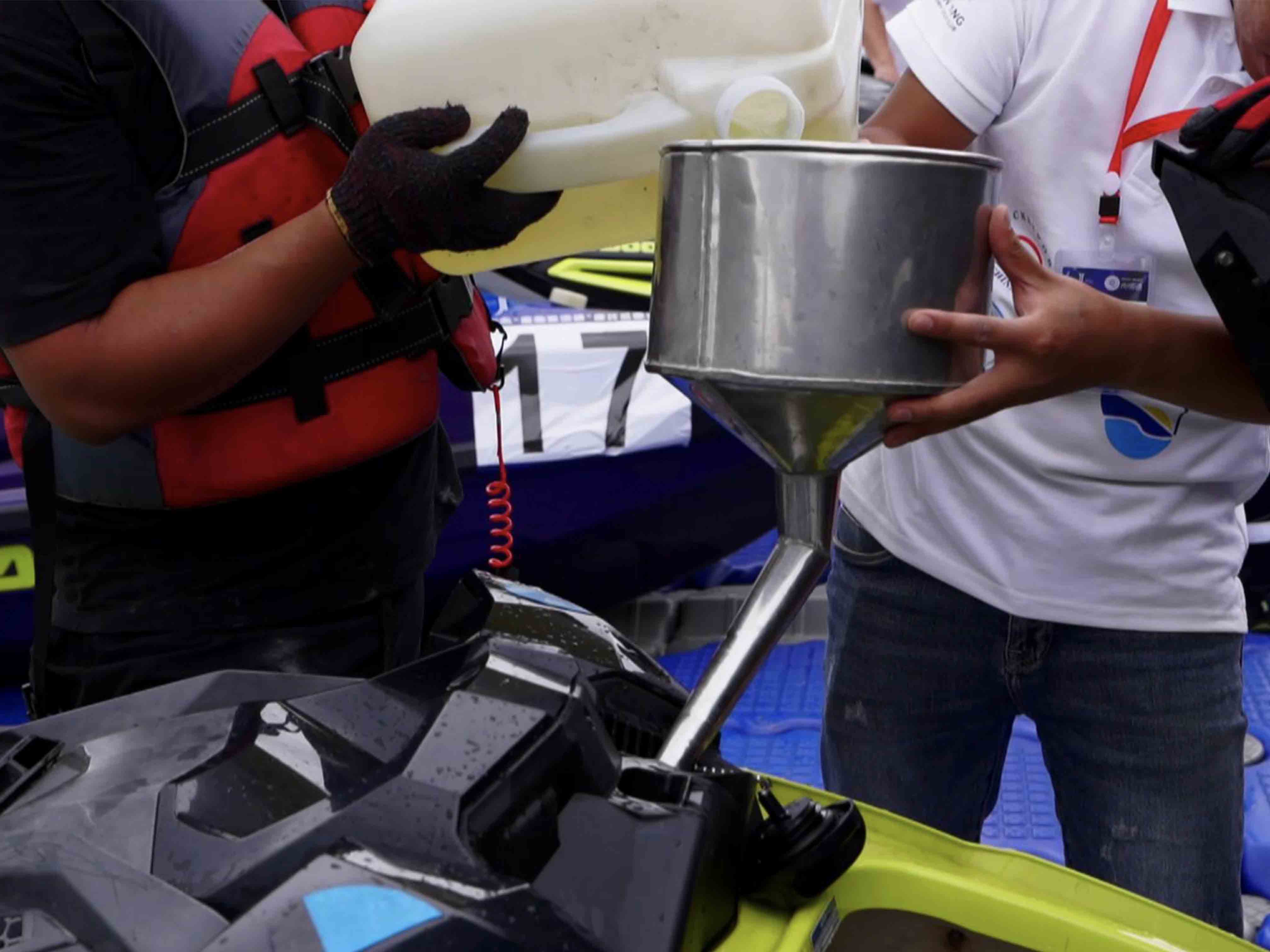 運(yùn)動員給自己的摩托艇添加燃料