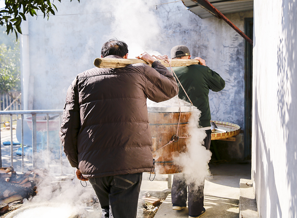 灶頭上,一只60多厘米高的木制大蒸籠冒著蒸汽,一股清香撲面而來(lái)。朱銀奎的大哥朱王奎邊向蒸籠里加糯米邊介紹,“昨天我們就把淘干凈的糯米用井水浸泡在水缸中,今天蒸糯米飯,這是釀年酒非常重要的一個(gè)環(huán)節(jié)。”