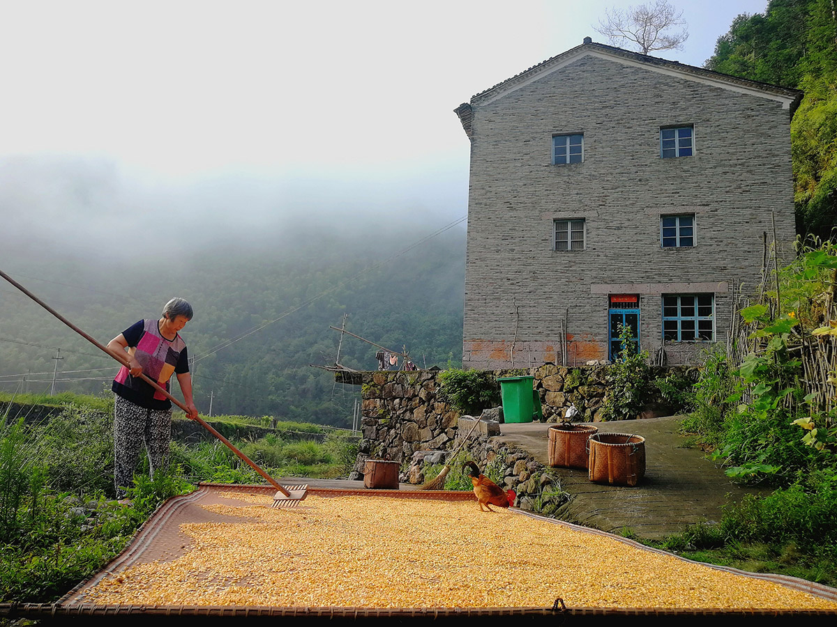 2018-08-05母親在屋旁曬玉米,自己家的公雞在吃玉米