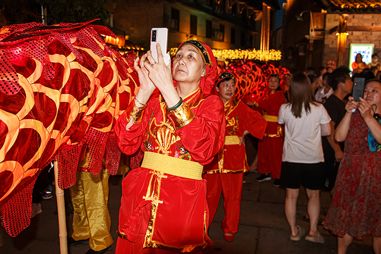 本照攝自2022年7月30日,黃巖嶼頭鄉(xiāng)舉辦的柔川旅游文化節(jié)開幕式。一位年過六十的老太太參加當(dāng)夜開幕式的舞龍表演,并乘表演前的空隙時(shí)間拿出手機(jī)來一張自拍,我立刻抓拍了一張。