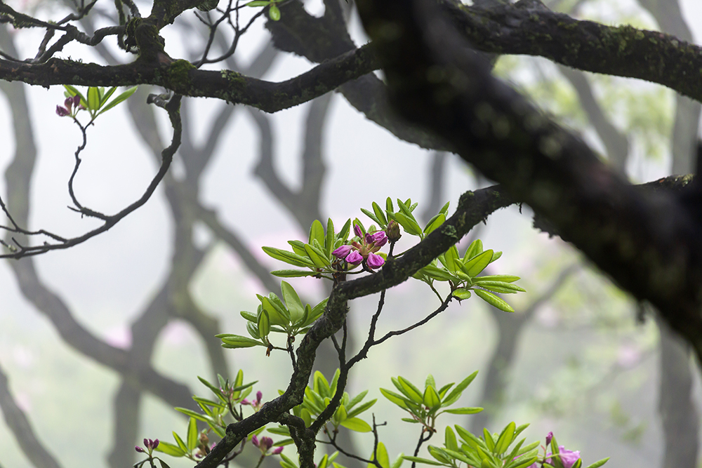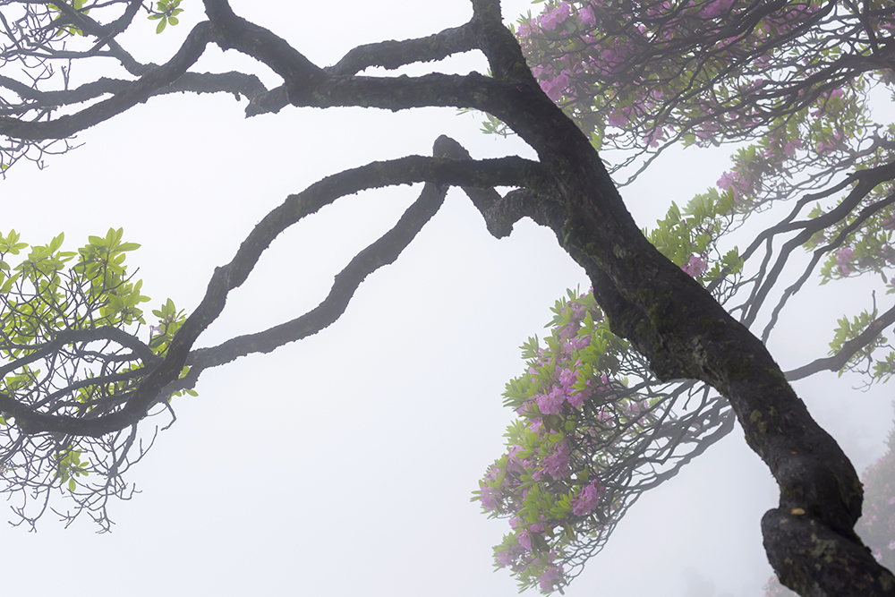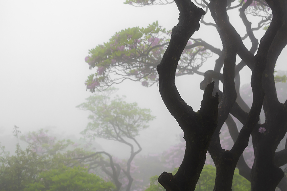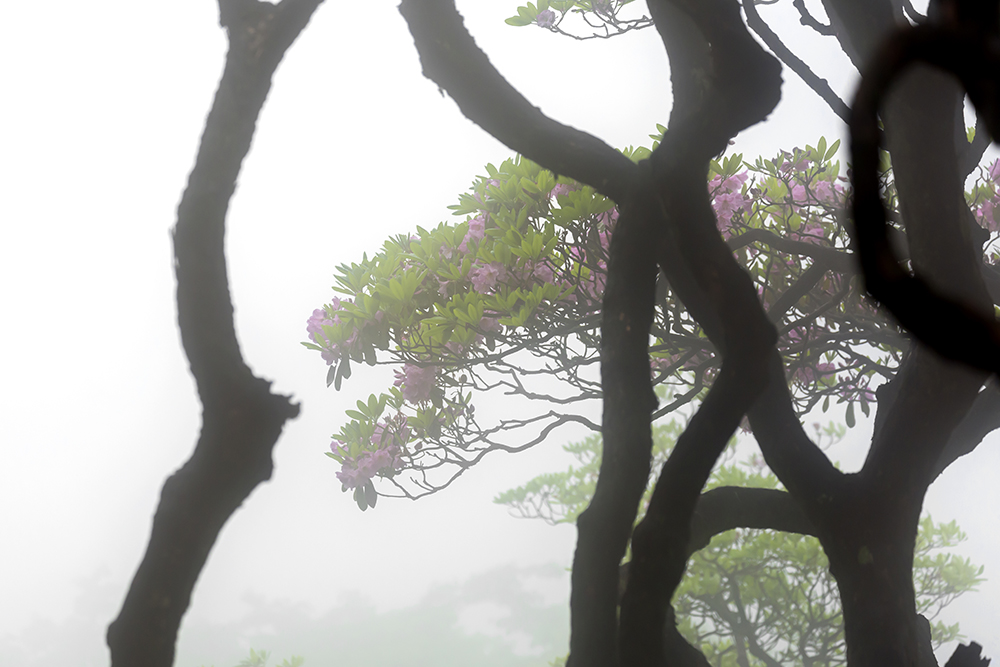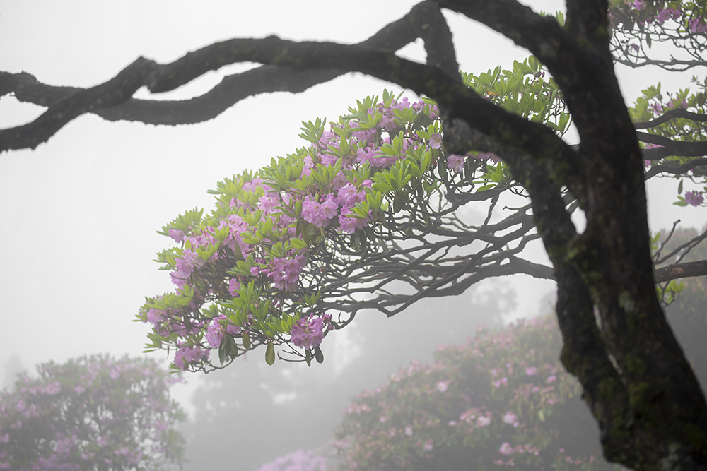 五月,杜鵑花開滿了華頂山坡,陣陣濃霧飄來,朦朦朧朧,似有似無,如若仙境。此時,彎彎曲曲的樹枝越發(fā)顯得婀娜多姿,剛?cè)嵯酀谎弁ィq如一幅幅水墨畫。