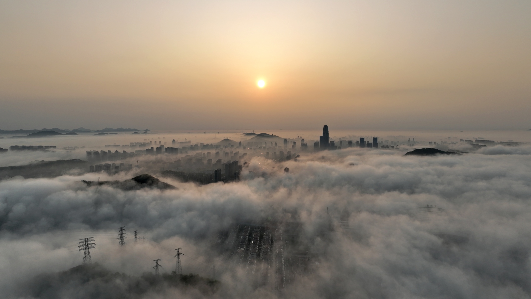 霧在城市(椒江)中穿梭,遠處的高樓大廈在陽光照射下顯得那么朦朧而迷幻,霧景如畫。