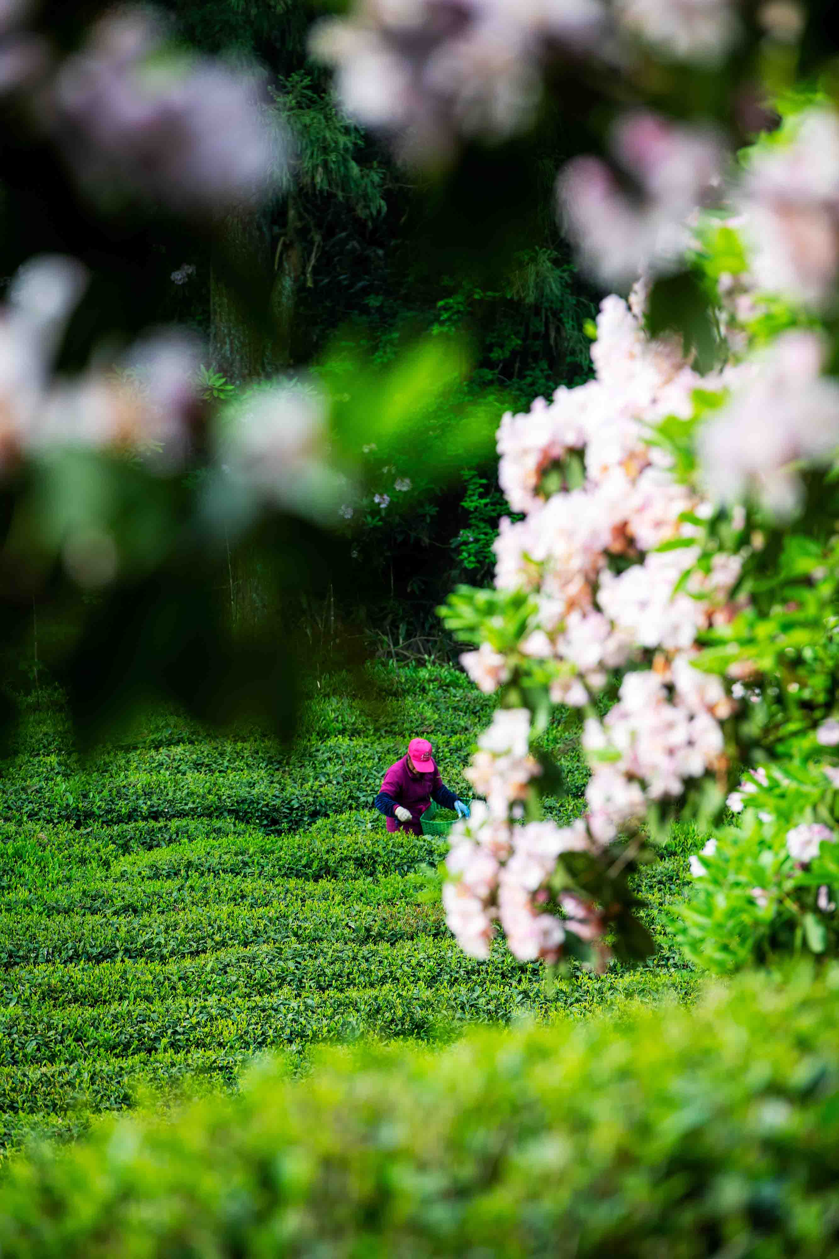 作品介紹: 5月,天臺(tái)石梁華頂,一名采茶工在盛開(kāi)的云錦杜鵑花下采茶。