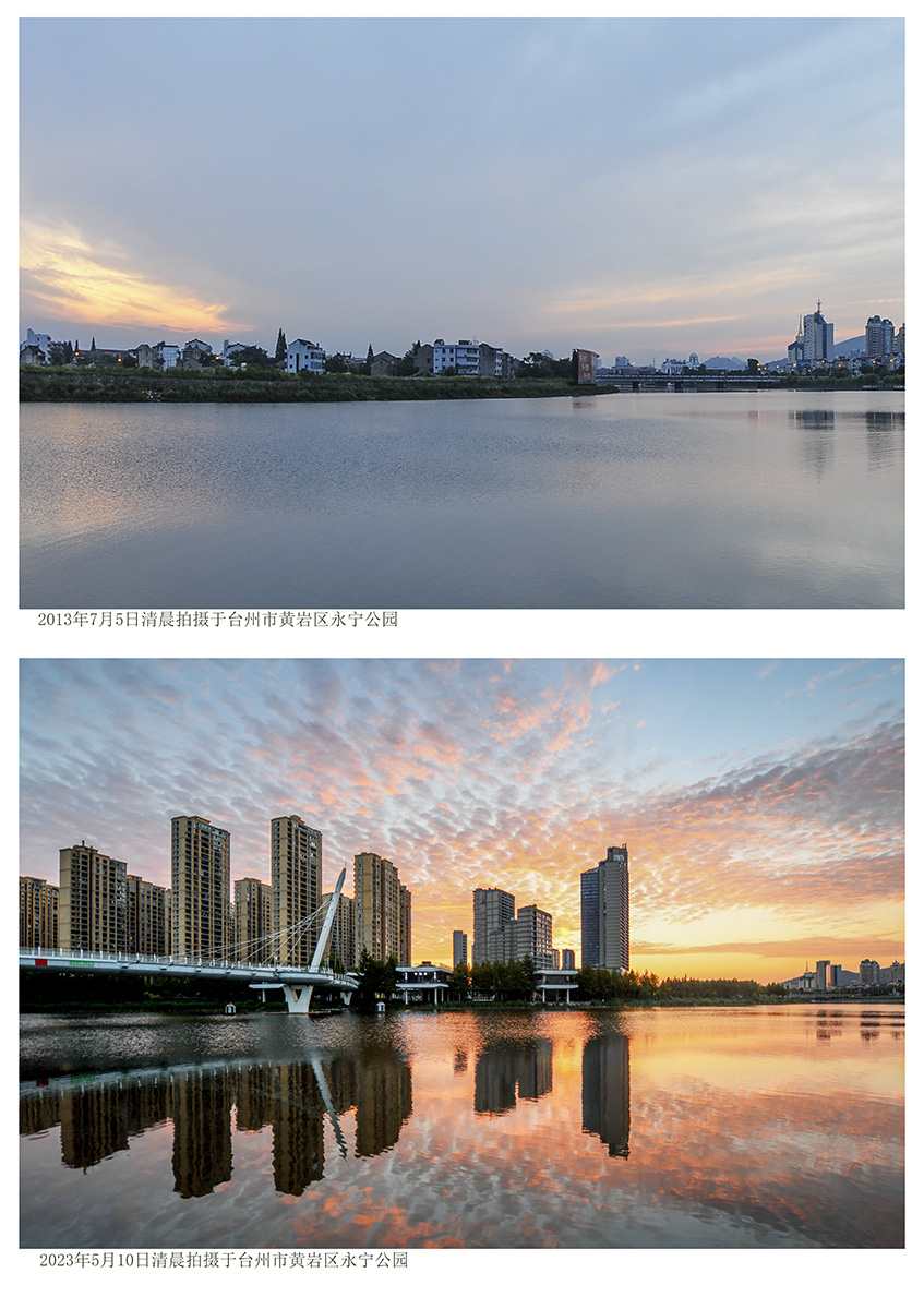 返回頂部>> 照片說明: 圖上:2013年7月5日清晨拍攝于臺州市黃巖區(qū)永寧公園; 圖下:2023年5月10日清晨拍攝于臺州市黃巖區(qū)永寧公園。 作品通過同一地點(diǎn)不同時間拍攝對比,紀(jì)錄了黃巖區(qū)城市建設(shè)的巨變。