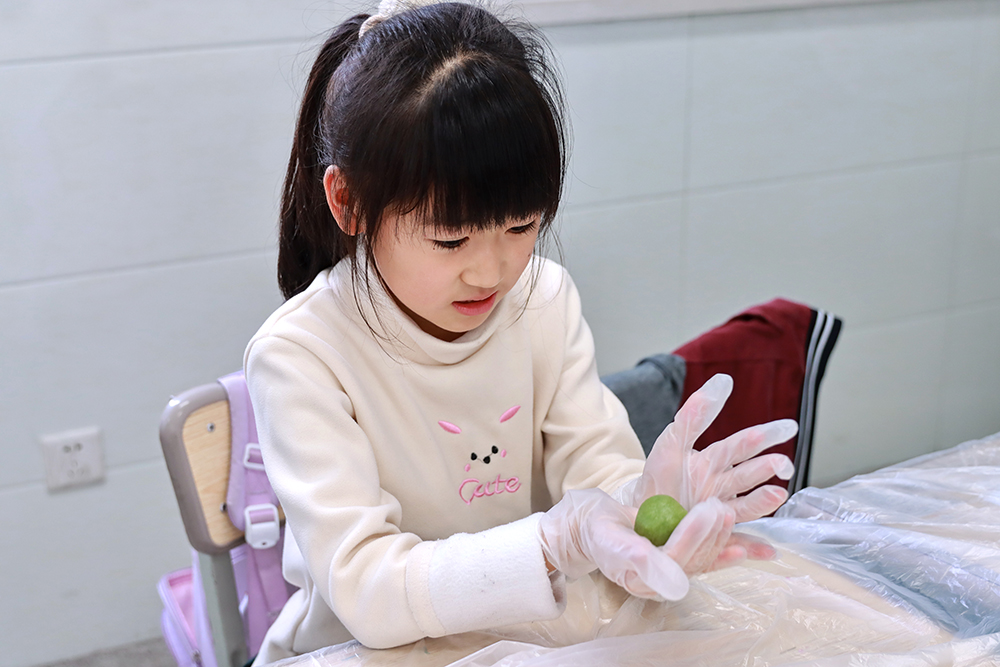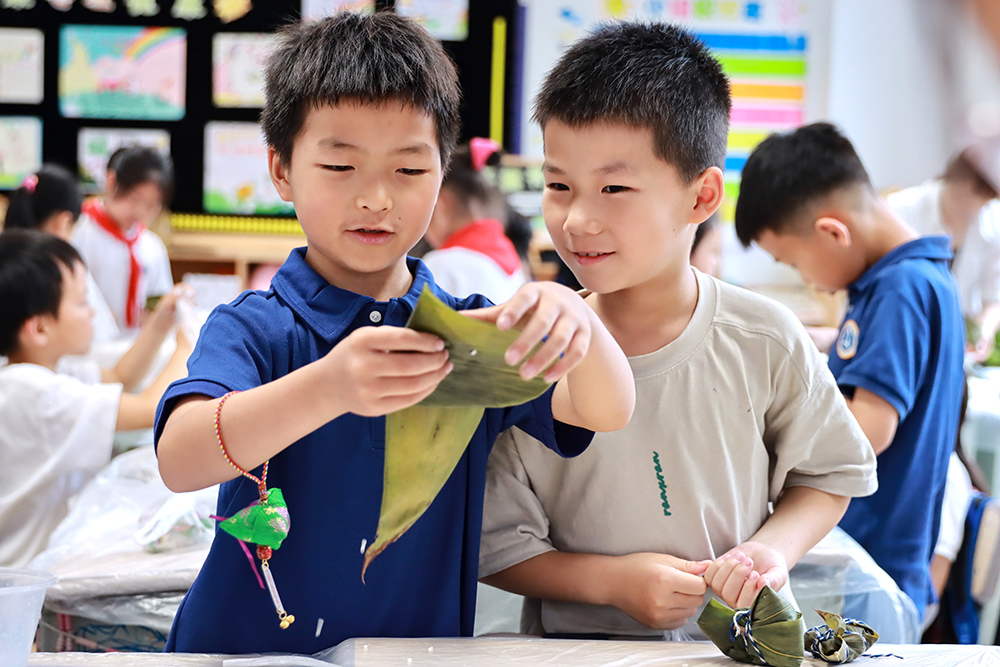 返回頂部>> 照片說(shuō)明: 聽(tīng)完老師的講解,小學(xué)生們紛紛與伙伴互相學(xué)習(xí),親自動(dòng)手嘗試包粽子。