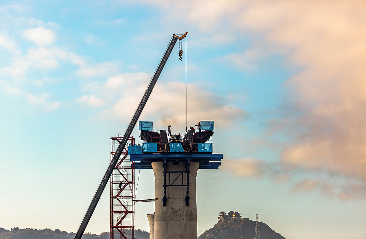 作品介紹: 晨光中,高高的橋墩上,建筑工人正忙著施工。