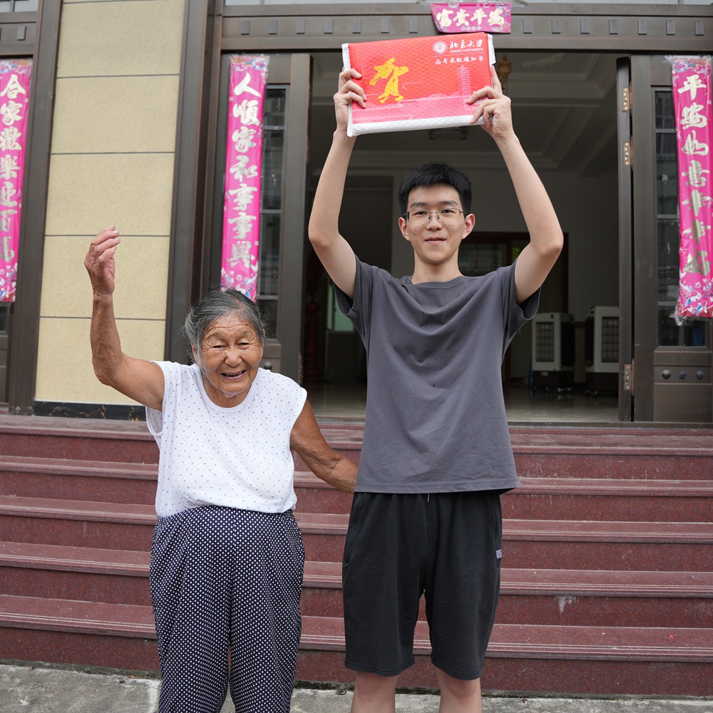小王拉著奶奶高興地在門前高舉起北大錄取通知書。