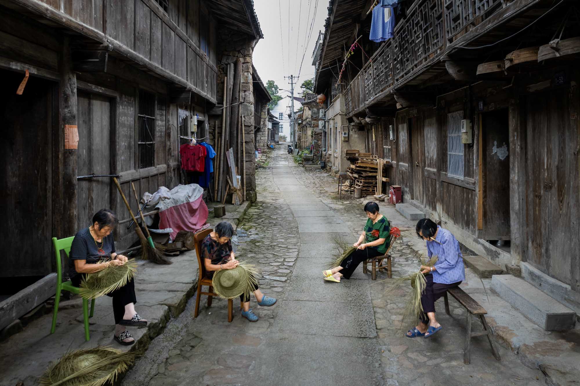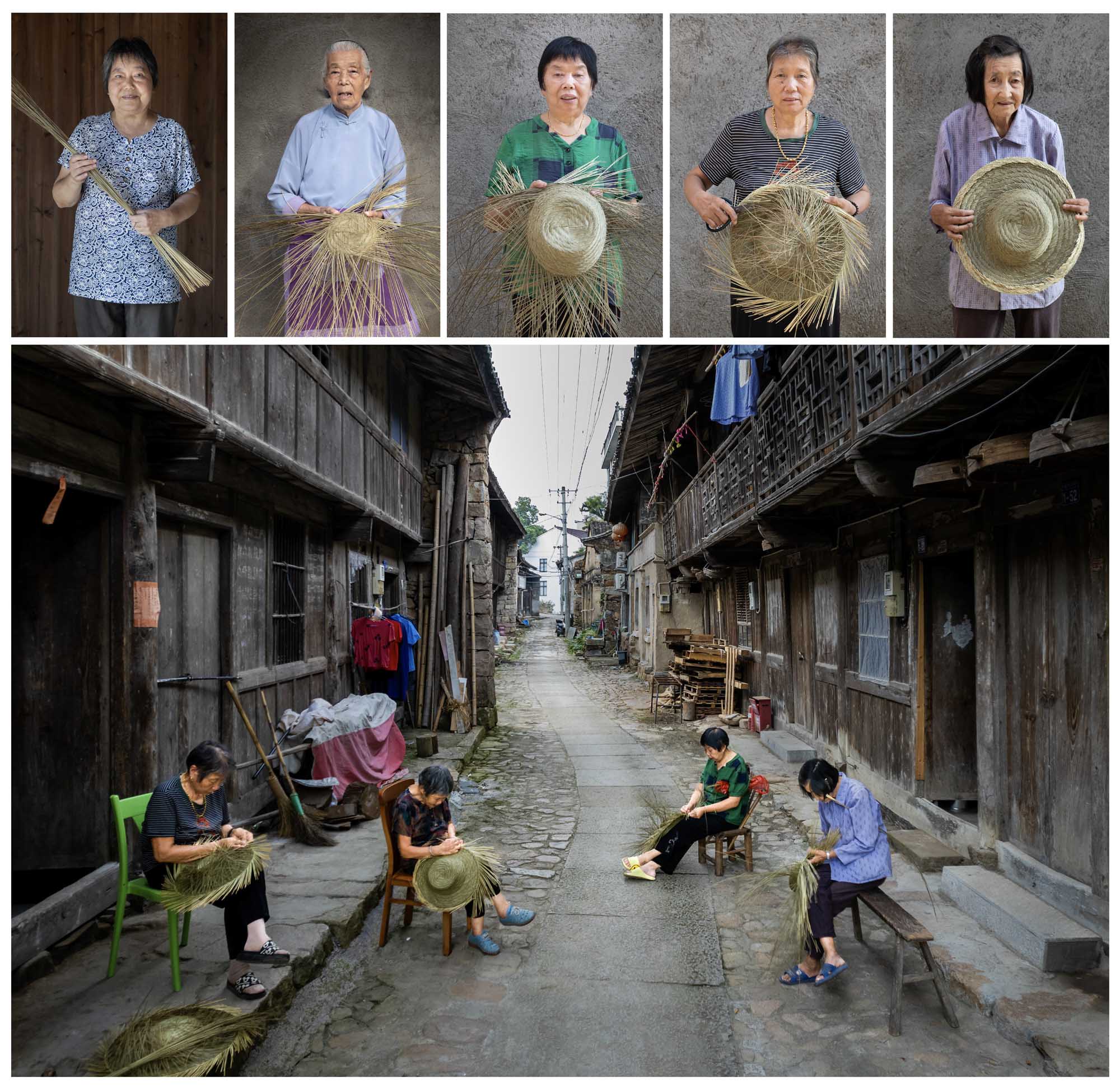傳統(tǒng)之美6:在古老而寧靜的老街上,四位手藝人專注地坐著,手中靈巧地編織著傳統(tǒng)的草帽。