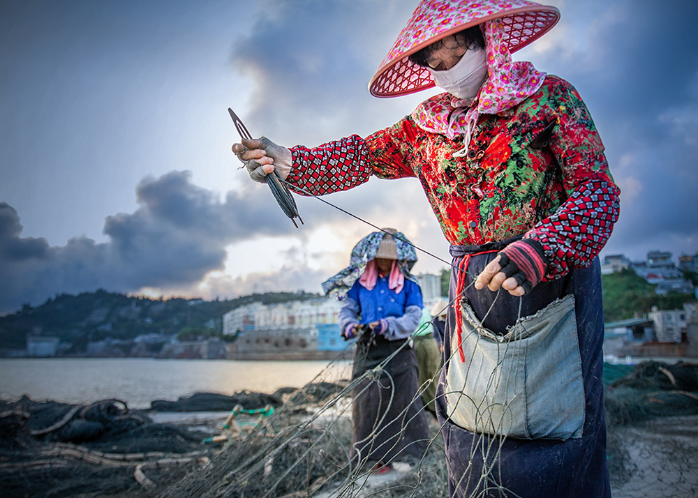 作品介紹: 織漁網(wǎng)就像織毛衣,網(wǎng)眼不同,織法也不同。而“補(bǔ)網(wǎng)”就像是縫衣服,網(wǎng)具破的窟窿不一樣,得靠經(jīng)驗(yàn),把網(wǎng)補(bǔ)得順滑平整,漁民出海才能收獲多多。